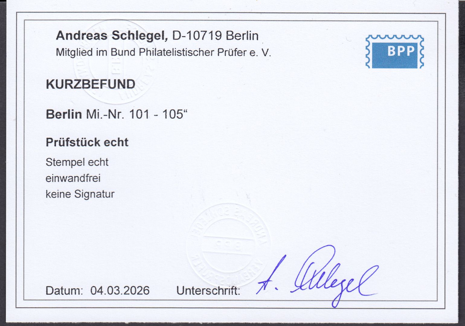 Berlin 1953, Mich.-Nr.: 101-05 LUXUS Vollstpl.  gepr  Befund Berlin-Charlottenburg