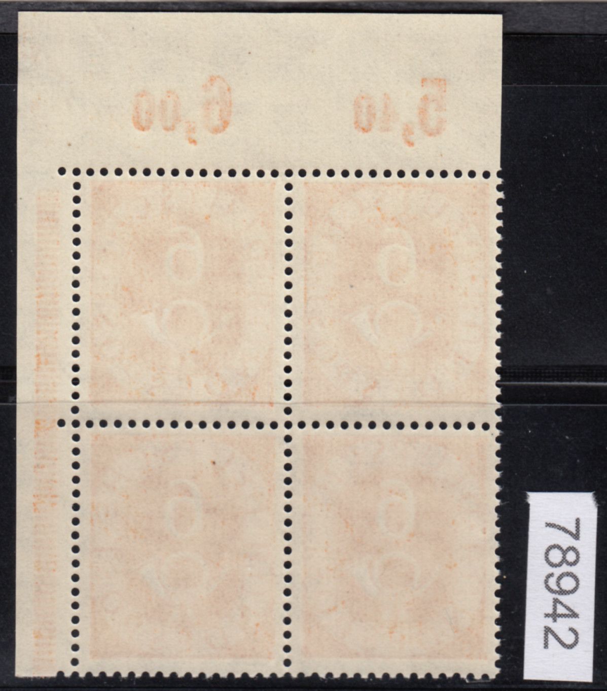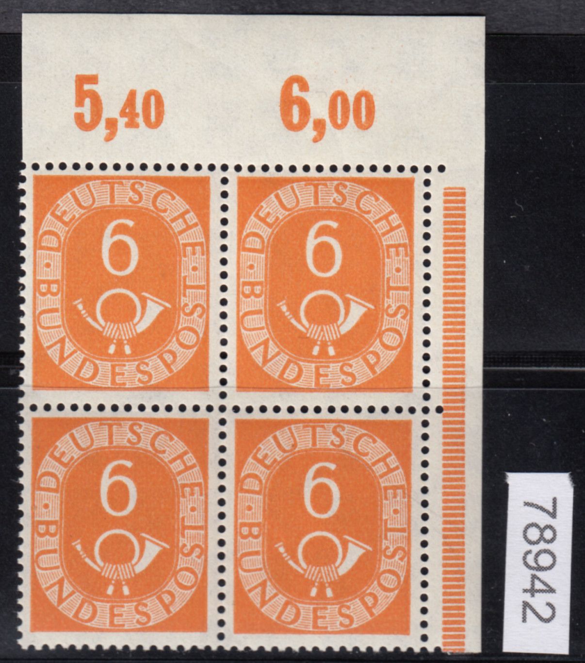 1951, 6 Pfg. Posthorn als postfrischer Eckrandviererblock aus der rechten oberen Bogenecke, Form 1, längere RSL, durchgummiert, ungefaltet in einwandfreier Qualität