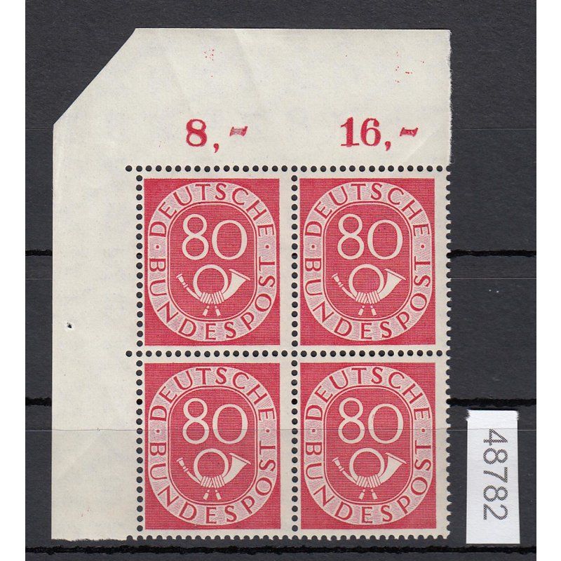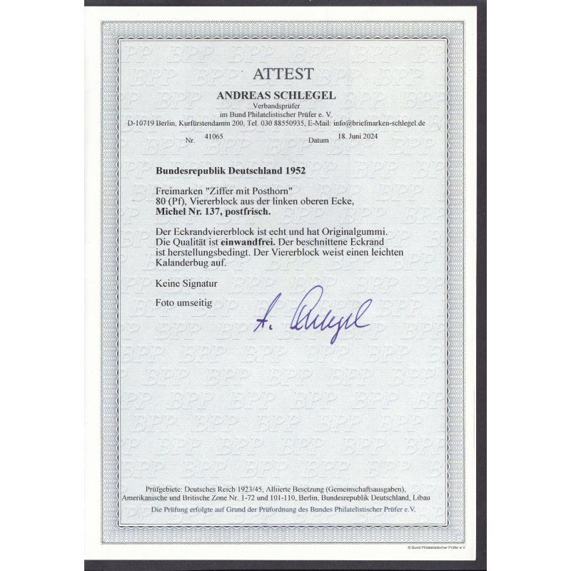 80 Pfg. Posthorn postfrisch im Viererblock aus der oberen Linken Bogenecke, ungefaltet und unsigniert in einwandfreier Qualität. Die Schräg geschnittene Ecke ist Herstellungsbedingt und kein mangel siehe Attest Mit Aktuellem Foto Attest Schlegel BPP " echt und einwandfrei " Sie bekommen den abgebildeten Artikel