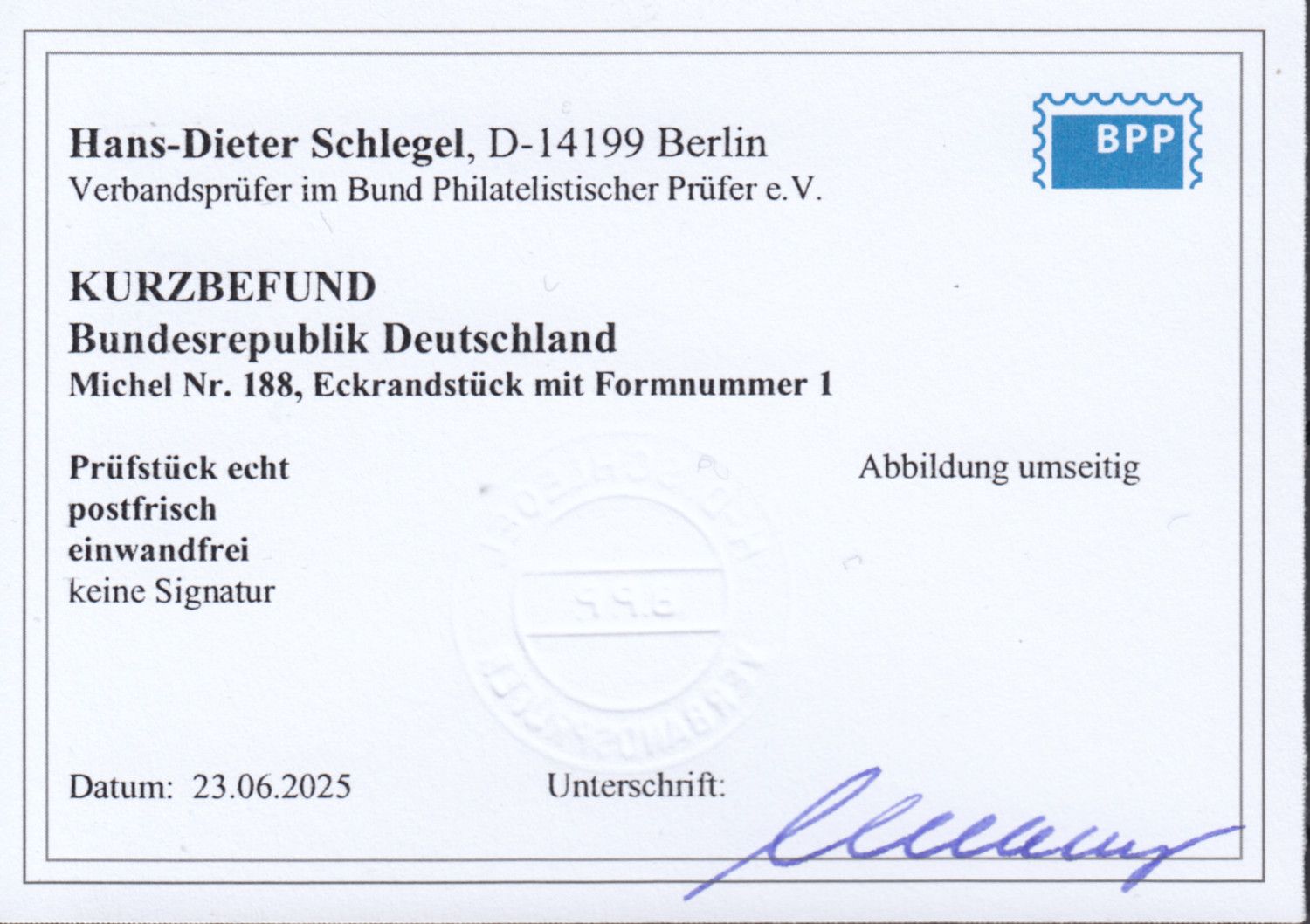 Bund 1954, Mich.-Nr.: 188 ** FN 1 Eckrand geprüft  Befund