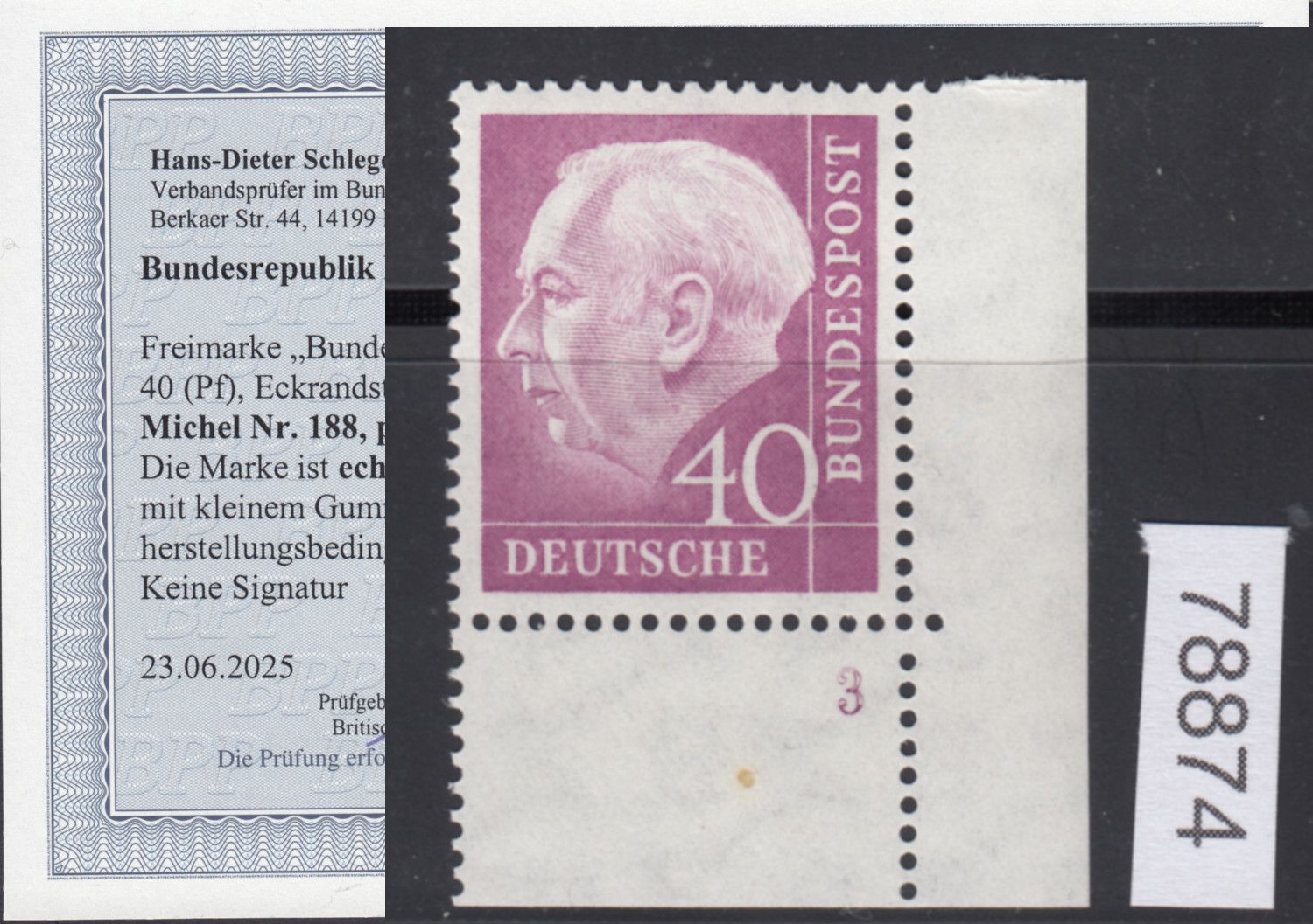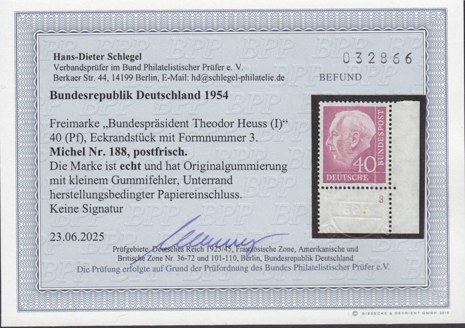 Bund 1954, Mich.-Nr.: 188 * FN 3 Eckrand geprüft  Befund