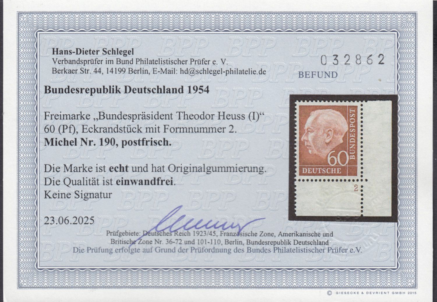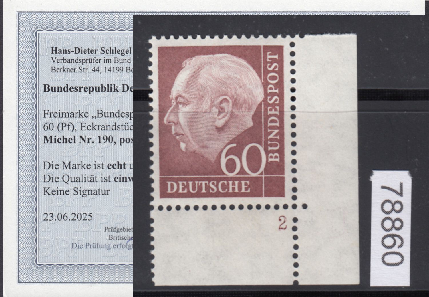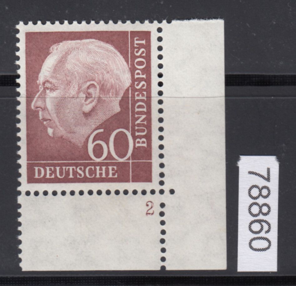 1954, 60 Pfg. Heuss (I), postfrische Bogenecken mit Formnummer, Fo.Nr. "2", einwandfrei, Fotobefunde Schlegel BPP 06/2025