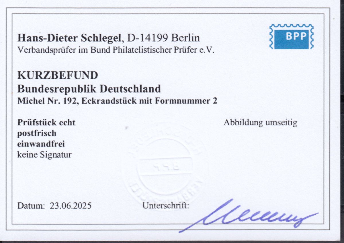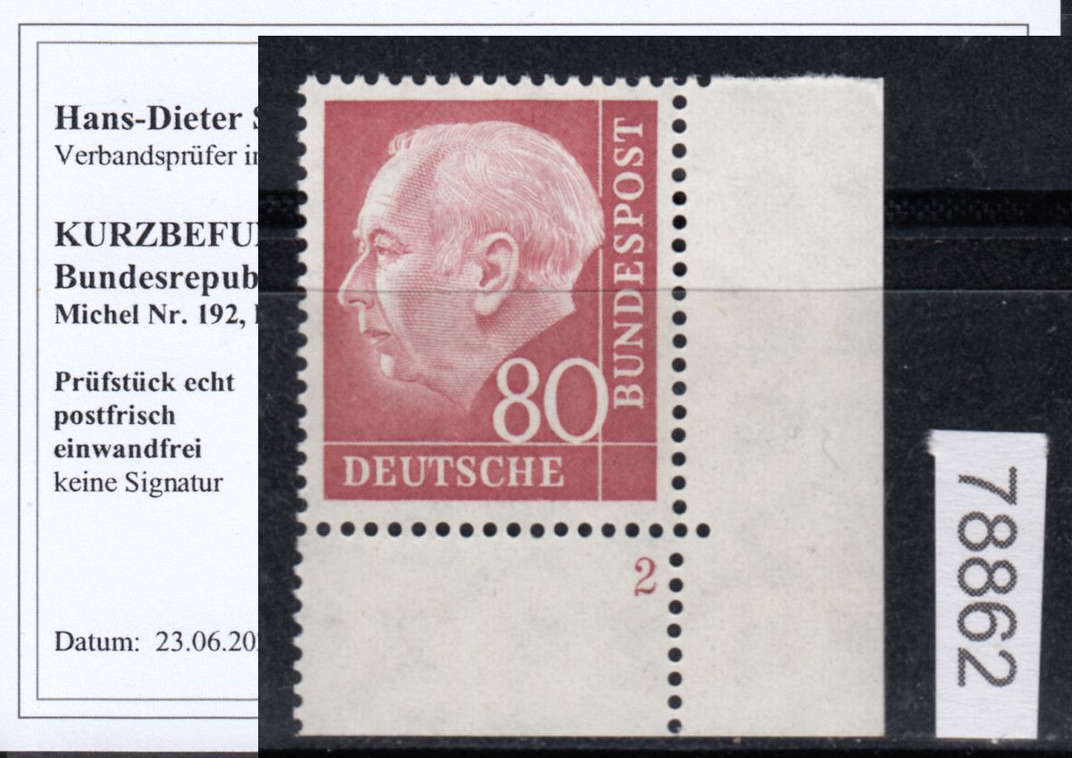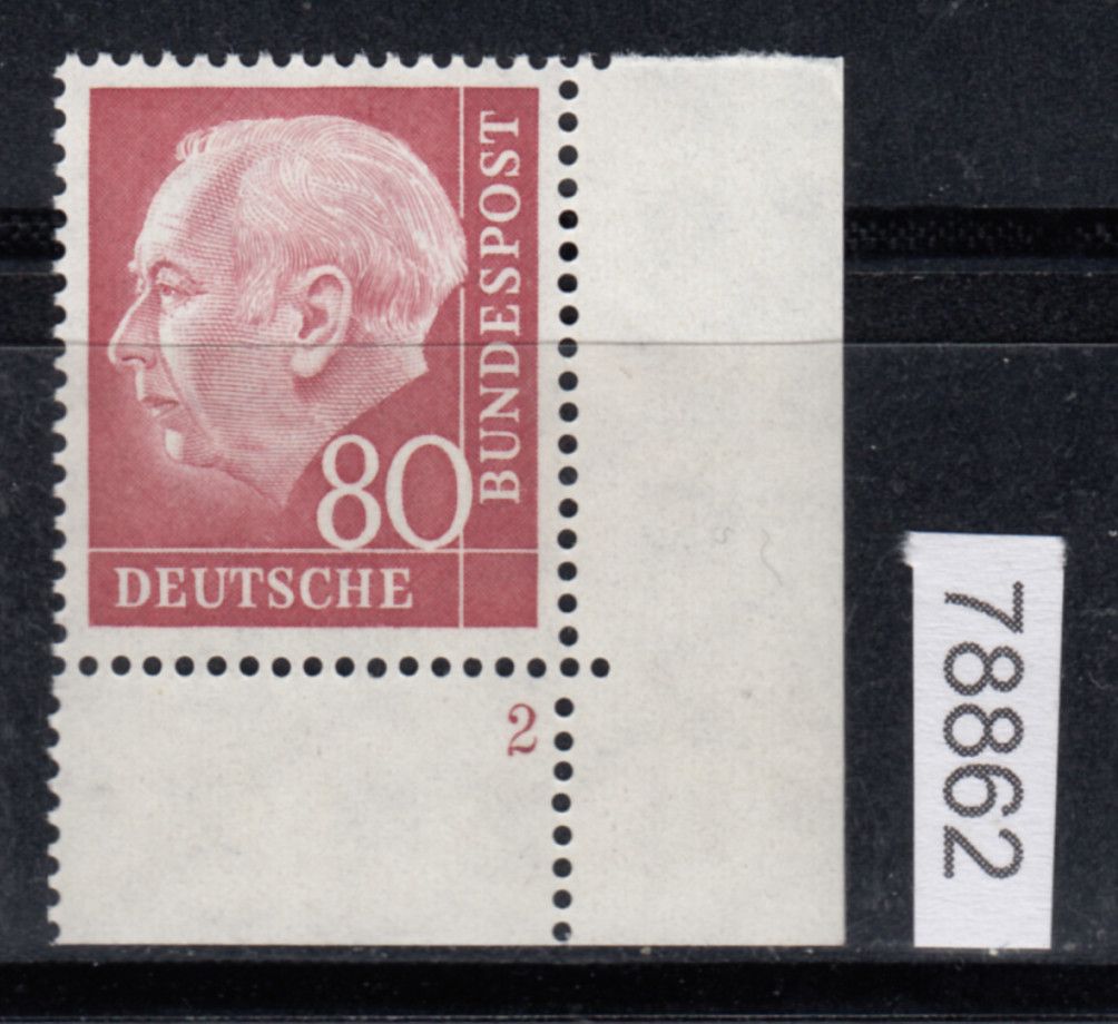 1954, 80 Pfg. Heuss (I), postfrische Bogenecken mit Formnummer, Fo.Nr. "2" einwandfrei, Fotobefunde Schlegel BPP 06/2025