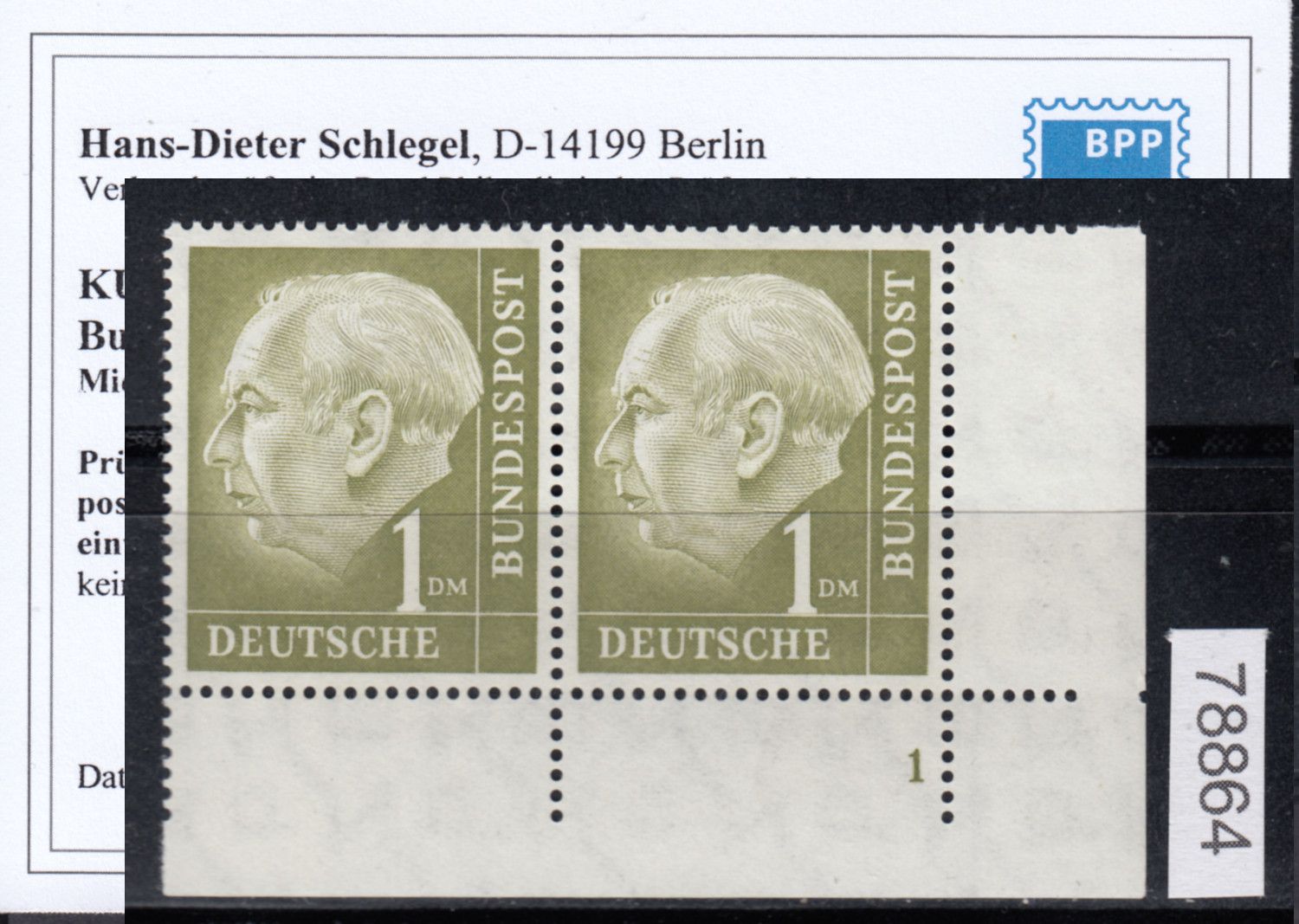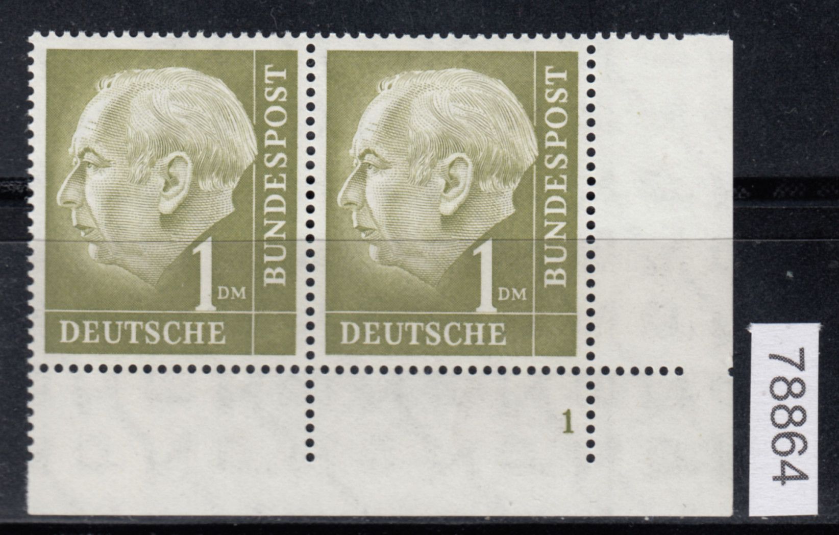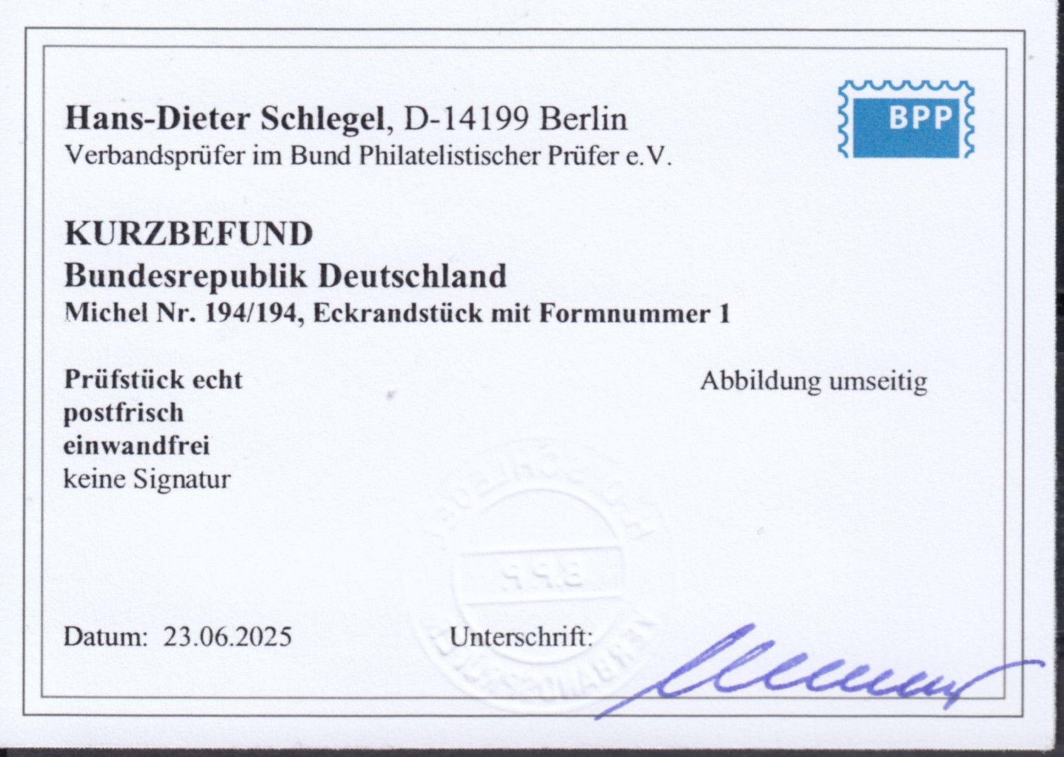 Bund 1954, Mich.-Nr.: 194 w ** FN 1  Eckrand  Zähnung V +1  glattes gummi   Selten