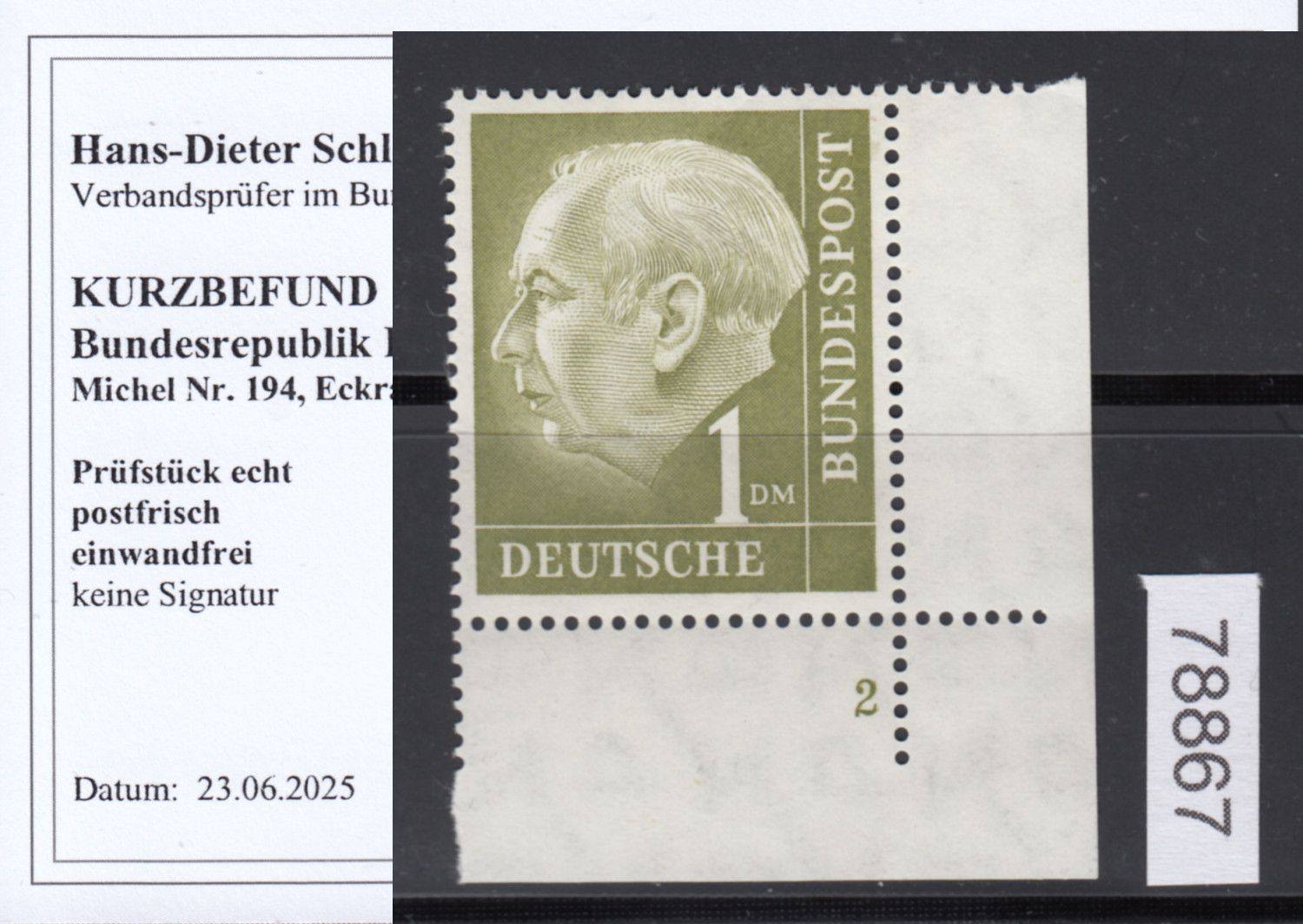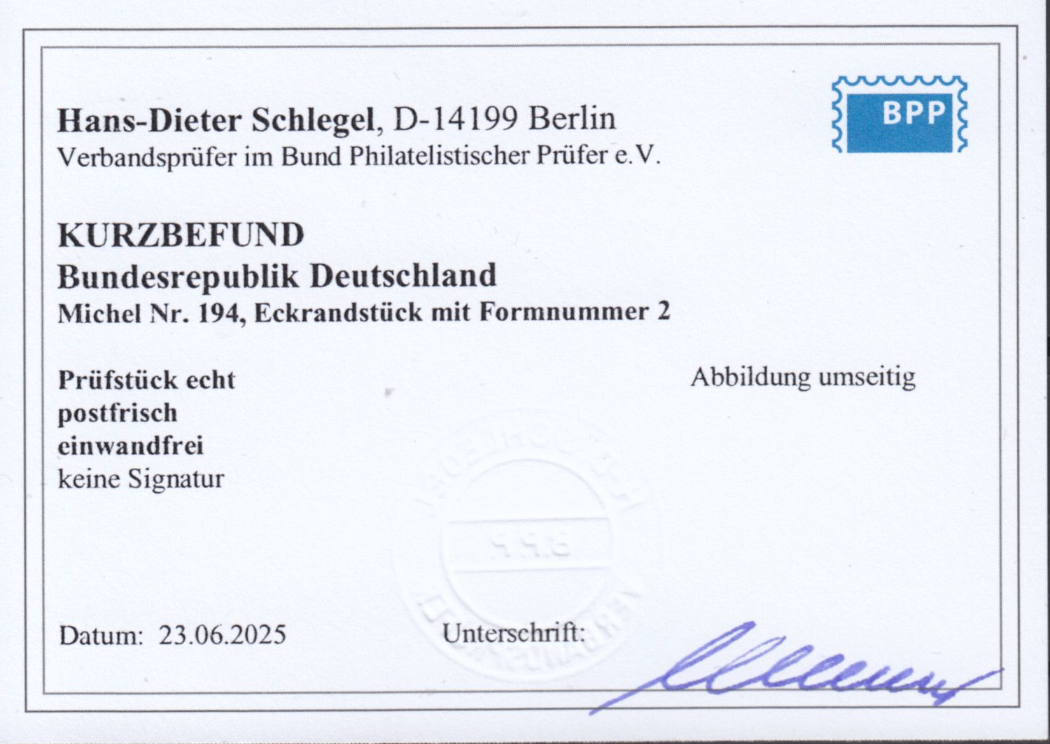 Bund 1954, Mich.-Nr.: 194 w ** FN 1  Eckrand  Zähnung V  glattes gummi  gepr. Befund