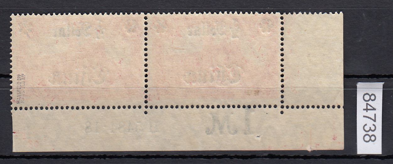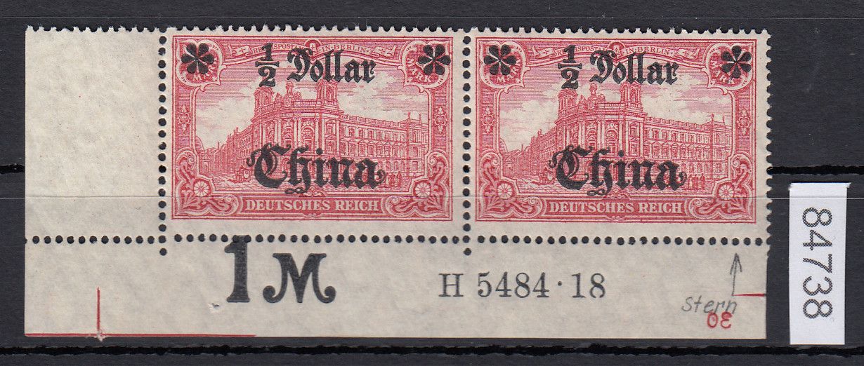 1/2 D. auf 1 M. Freimarke 1906/1919, waagerechtes Paar aus der linken unteren Bogenecke nicht gefaltet mit HAN ,,H 5484.18" und Plattenfehler ,,I" (rechte Rosette auf einer Spitze), doppelt geprüft Mansfeld BPP. Mi. 520,-€