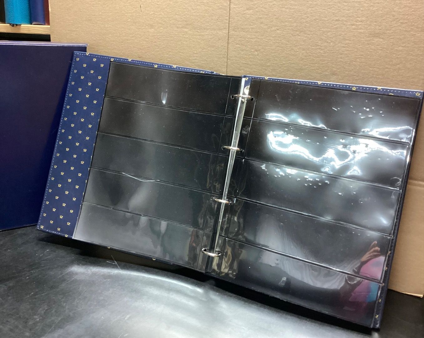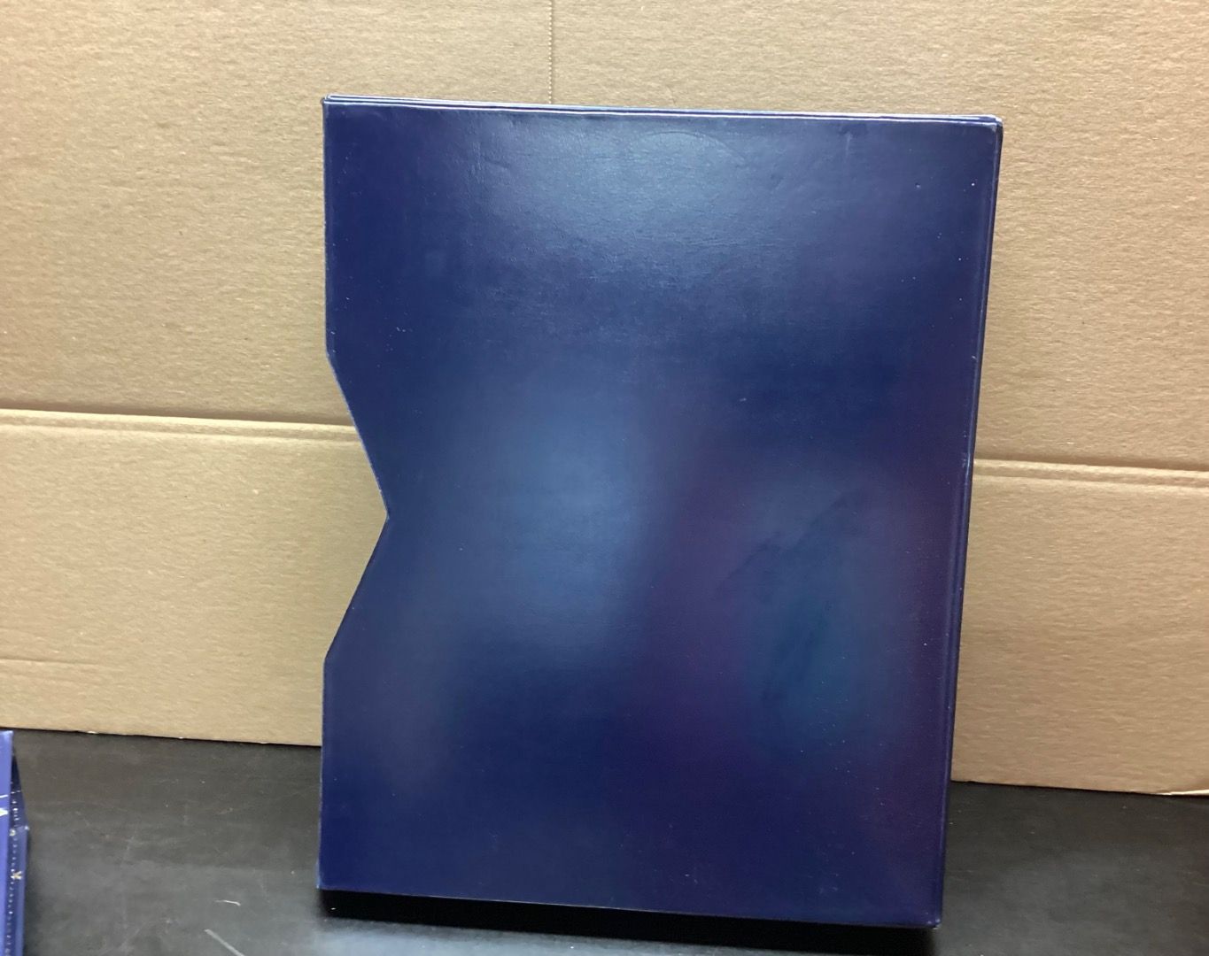 Album mit Ringbindung + Schuber, mit 50 schwarzen Hüllen (5 Taschen), beidseitig verwendbar. . Gut erhalten mit kleinem Mangel. Kleine Abschabung Innenseite Album + einige Hüllen stark gebraucht . Farbe: Blau. Mehrfach kaufen, nur einmal Porto.