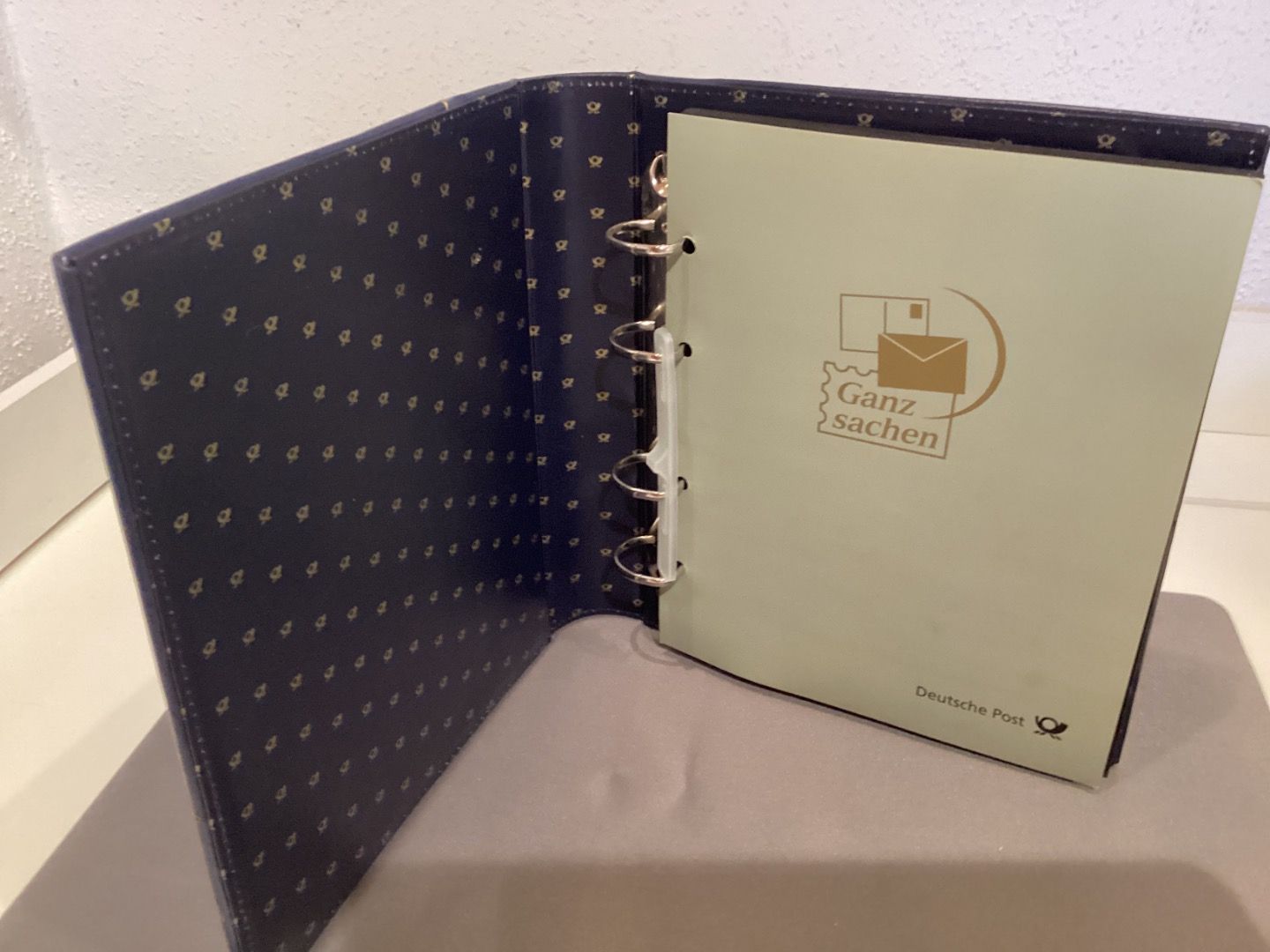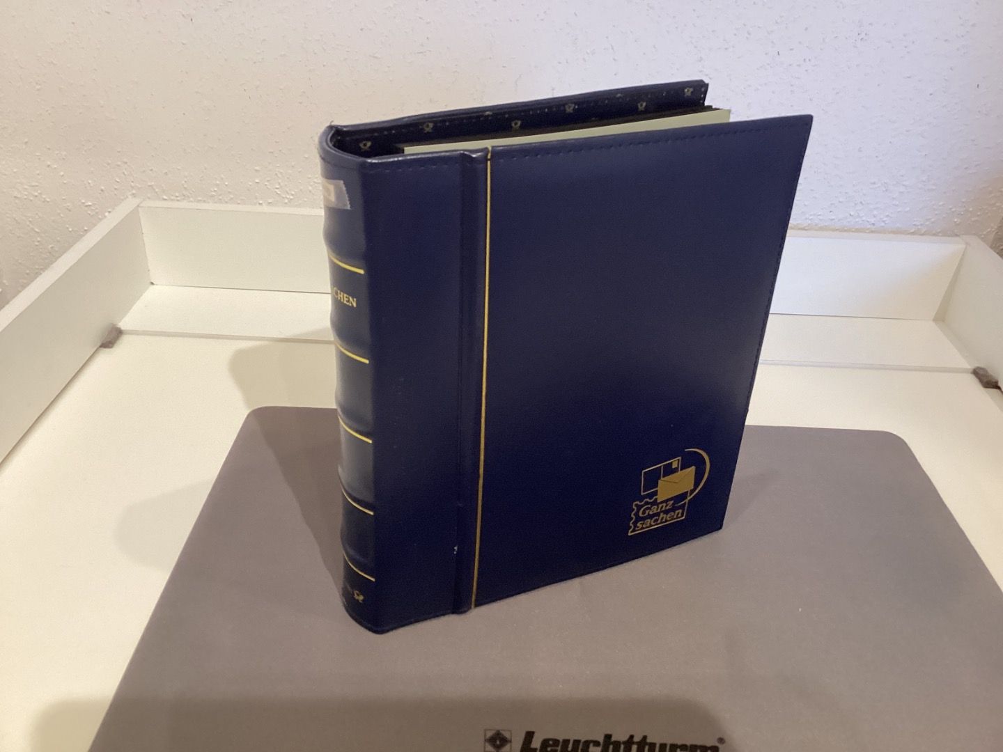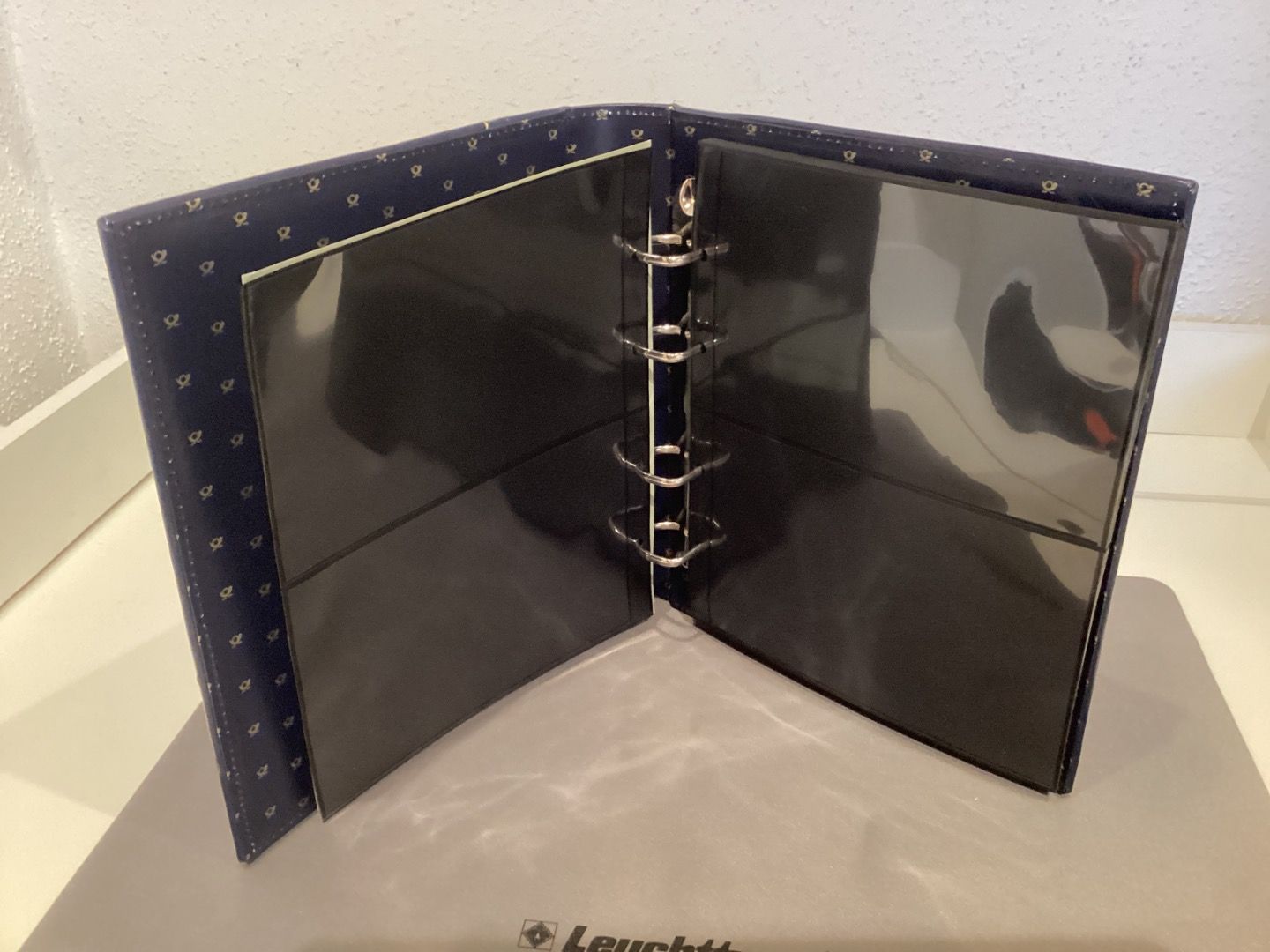 Album mit Ringbindung ( 4 Ringe) aus lederähnlichen Material mit Goldprägung.Zum Lieferumfang gehören 20 Hüllen,2- geteilt,beidseitig nutzbar.Farbe: Königsblau. Sehr gut erhalten. Sie erhalten den abgebildeten Artikel.Mehrfach bestellen,nur einmal Porto.