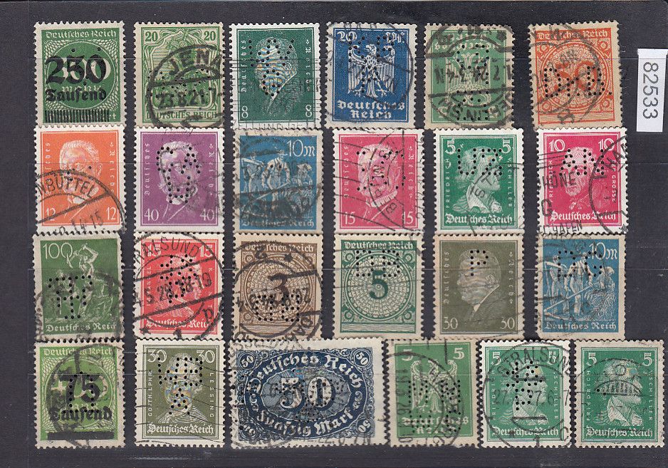 Wir lösen eine große Sammlung Perfins / Lochungen auf (ca. 20,000 Stk) hierraus erhalten Sie die im Bild zu sehen Marken. Erhaltung entnehmen Sie bitte dem Bild. Weitere Artikel im Shop und der Kategorie "Firmenlochungen, Perfins " Sie bekommen den abgebildeten Artikel