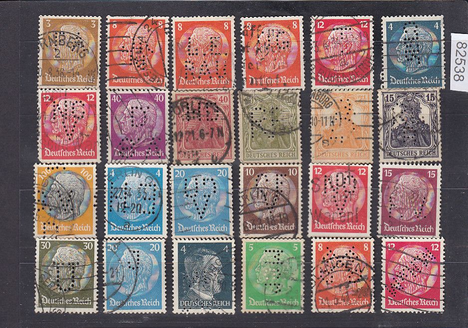 Wir lösen eine große Sammlung Perfins / Lochungen auf (ca. 20,000 Stk) hierraus erhalten Sie die im Bild zu sehen Marken. Erhaltung entnehmen Sie bitte dem Bild. Weitere Artikel im Shop und der Kategorie "Firmenlochungen, Perfins " Sie bekommen den abgebildeten Artikel