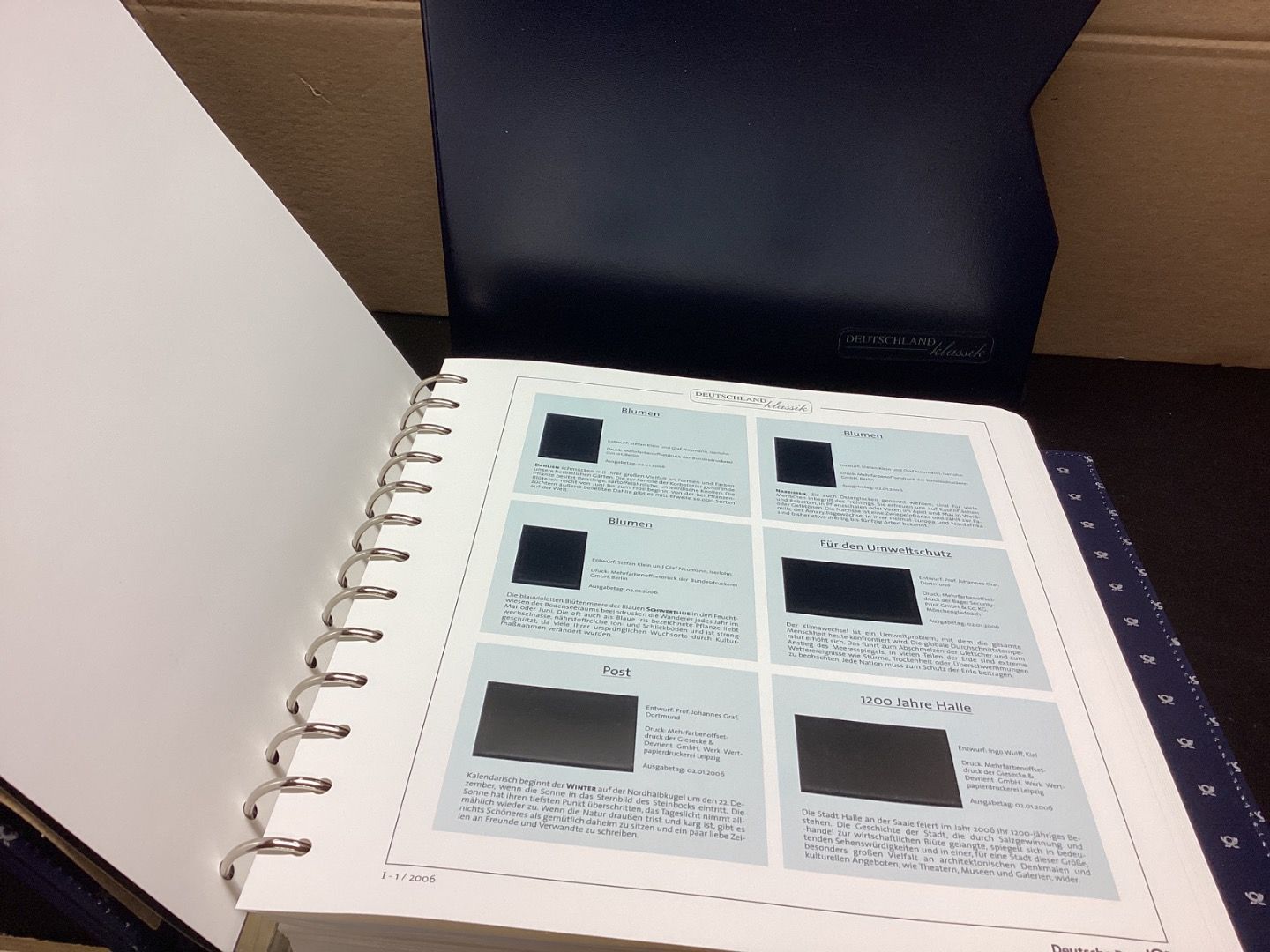 Alben der Deutschen Post mit den Vordrucken für je eine Marke (nach Michel) mit den entsprechenden Beschreibungen zu jeder Briefmarke mit schwarzen Klemmtaschen, Gebraucht mit geringen Gebrauchsspuren. Sie erhalten den abgebildeten Artikel.Mehrfach bestellen,nur einmal Porto.