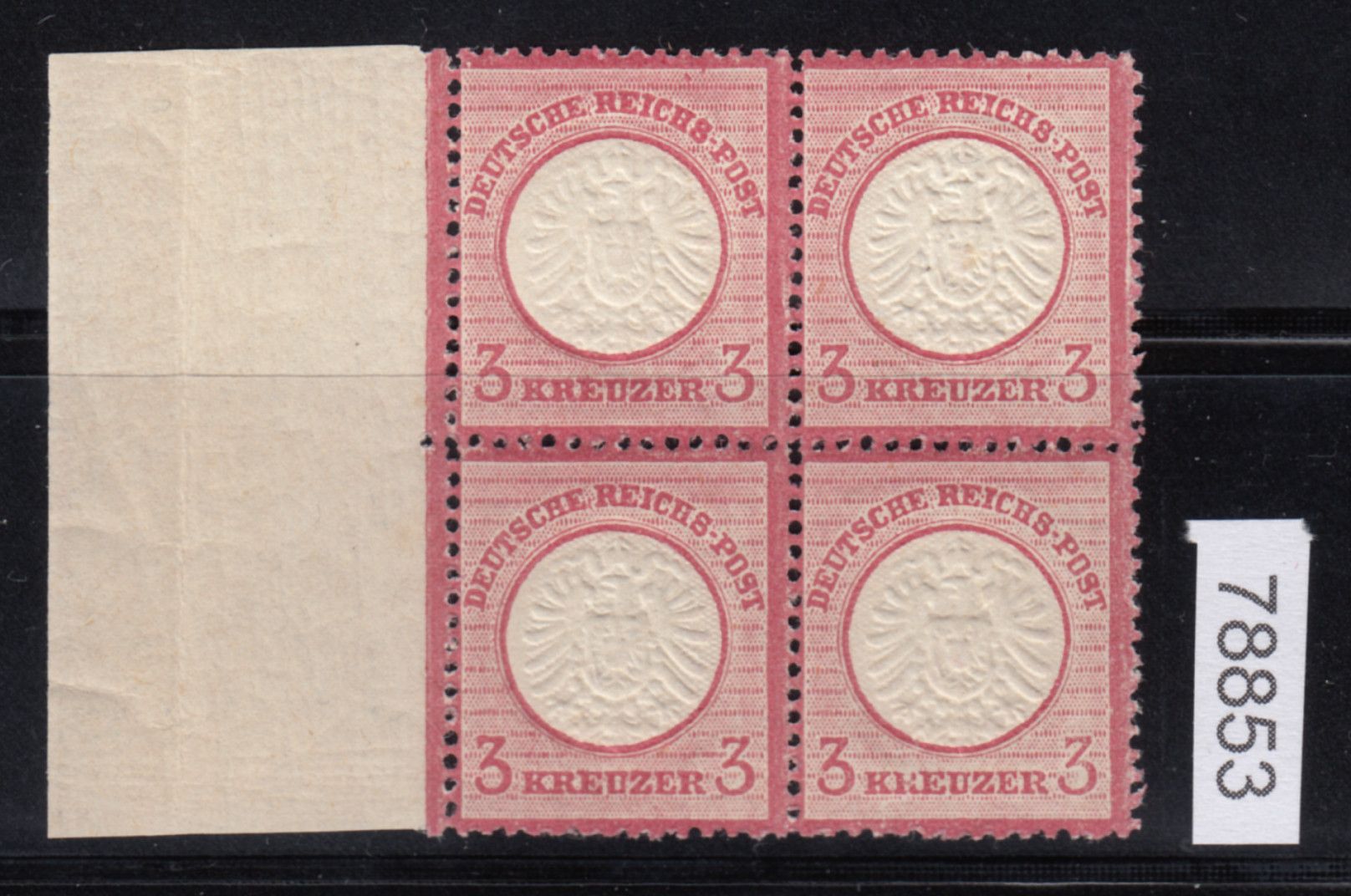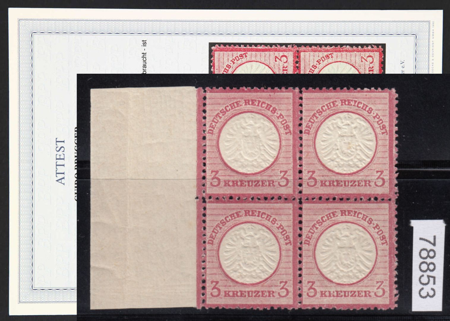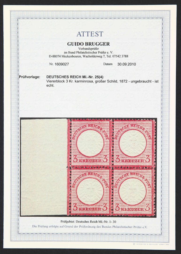 1872, 3 Kr. großer Brustschild karmin, postfrischer 4er-Block vom linken Bogenrand, außerordentlich farbfrisch, sehr gut und erhaben geprägt sowie in sehr guter, teils durchstichartiger rauer Zähnung, unsigniert, einwandfrei, Fotoattest Brugger BPP (im Michel postfr. nicht gelistet)