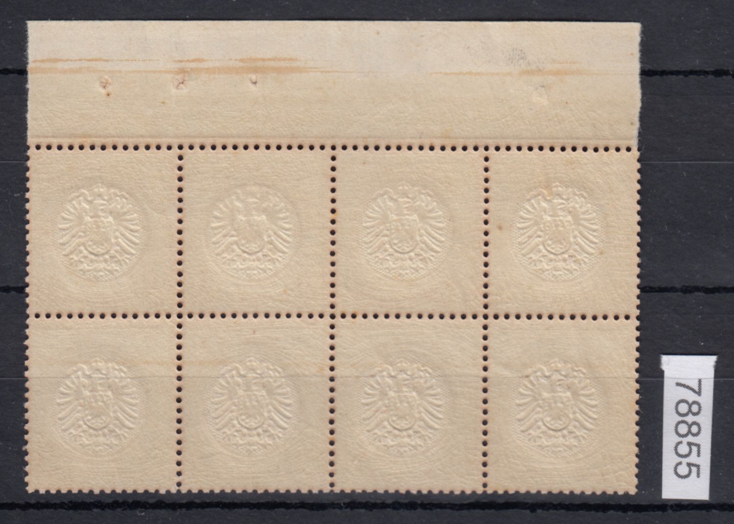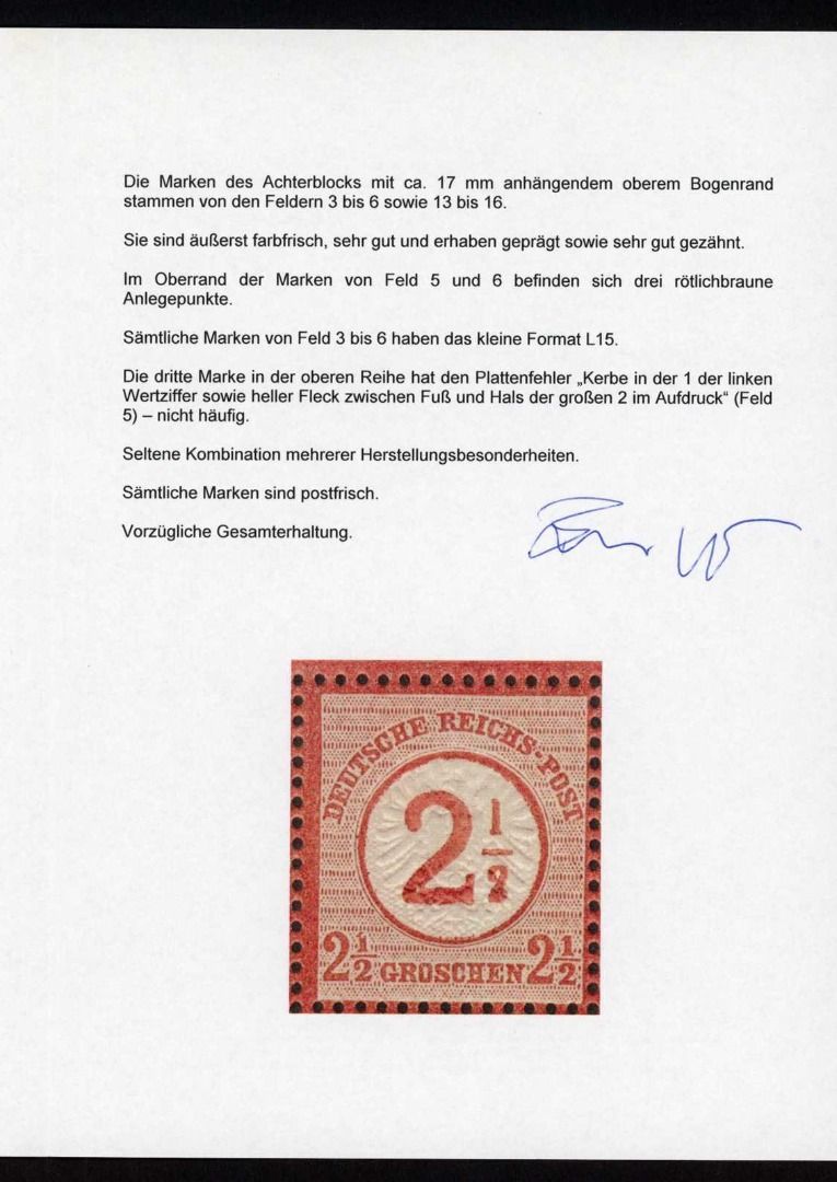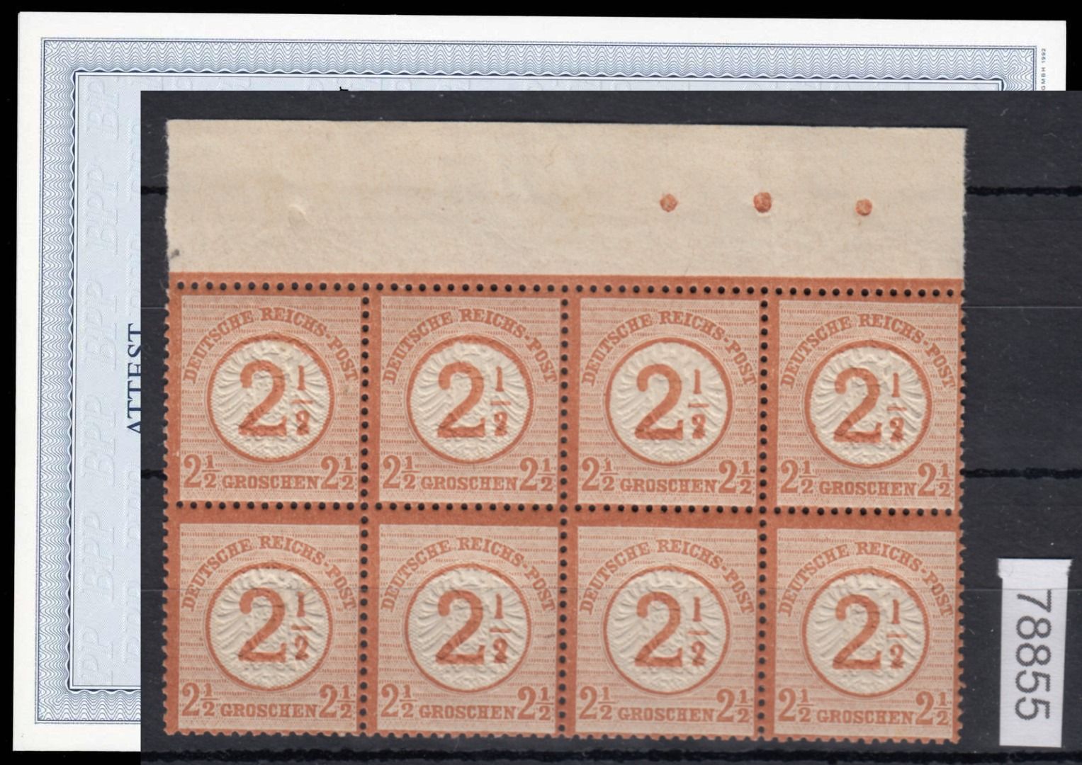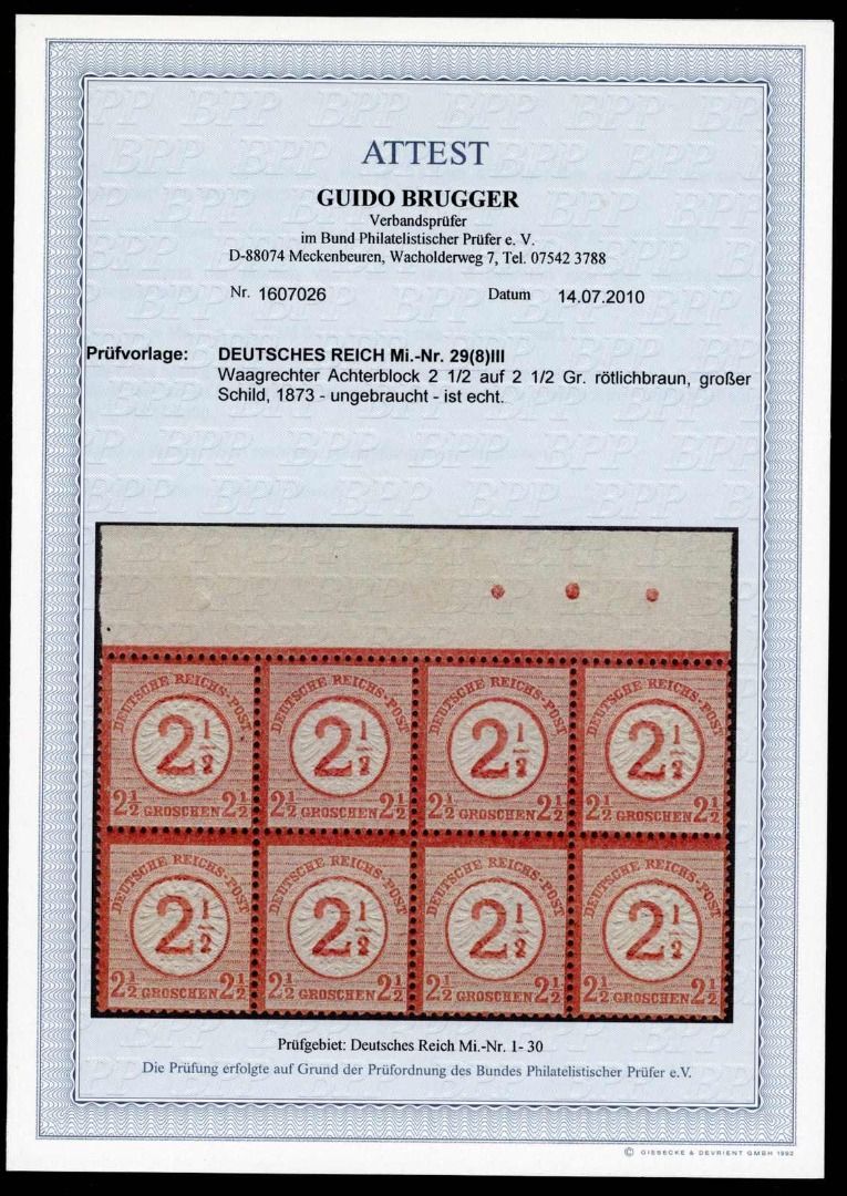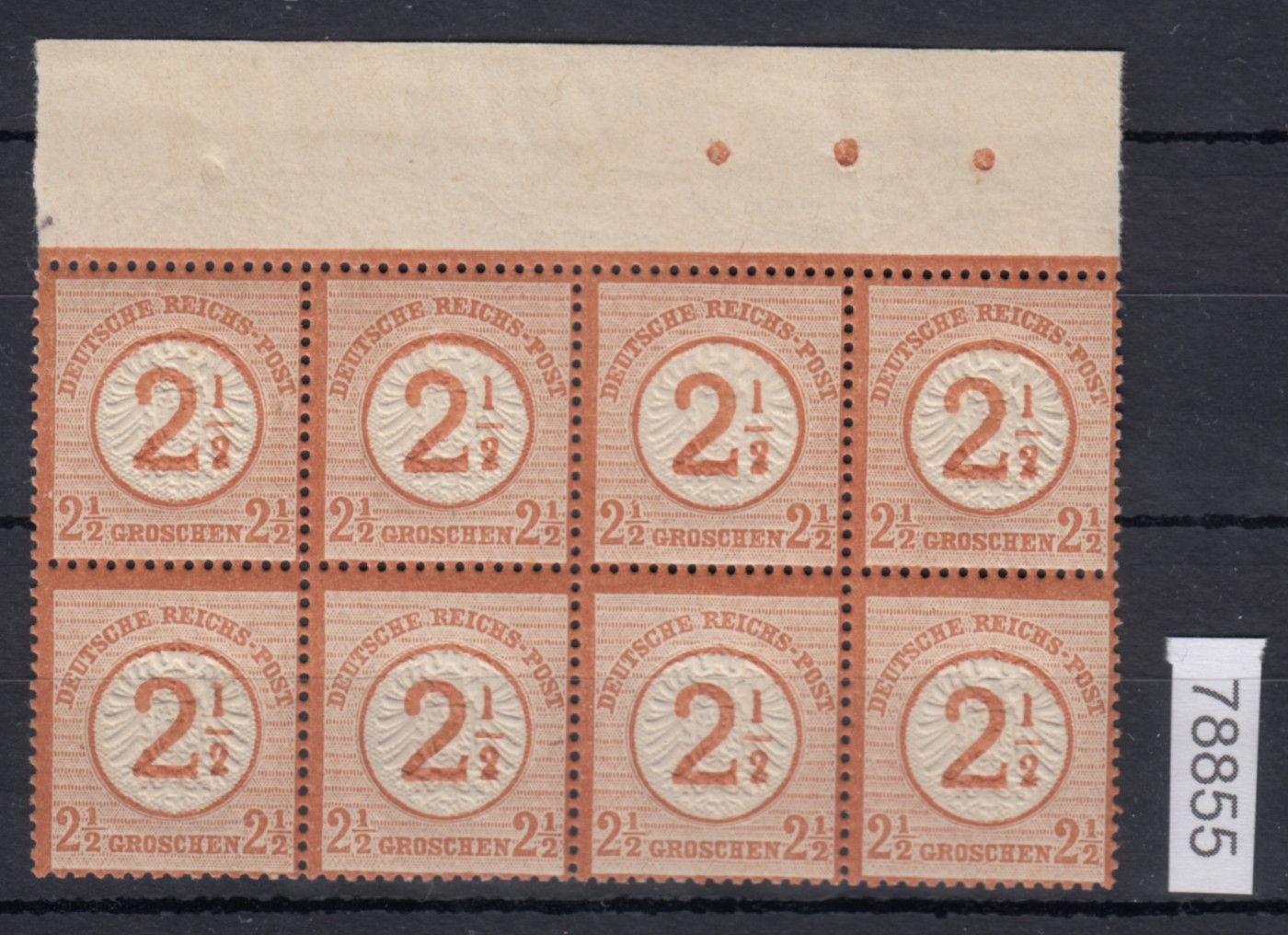 1874, 2½ auf 2½ Gr. mittelbraunorang, postfr. 8er-Block vom Oberrand, äußerst farbfrisch, sehr gut und erhaben geprägt sowie sehr gut gezähnt, leichte Falzspuren im Oberrand, einwandfrei, Fotoatest Brugger BPP (postfr. Einheiten im Michel nicht bewertet)