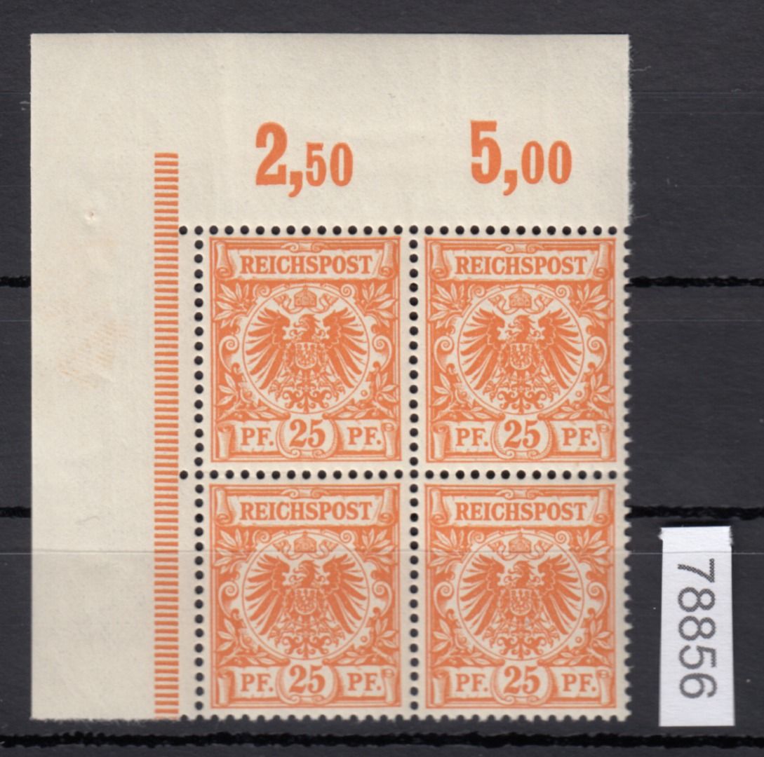 1889, 25 Pfg. Krone/Adler dunkelorange als postfrischer Eckrandviererblock oben links, ungefaltet und unsigniert, selten in dieser Luxusqualität