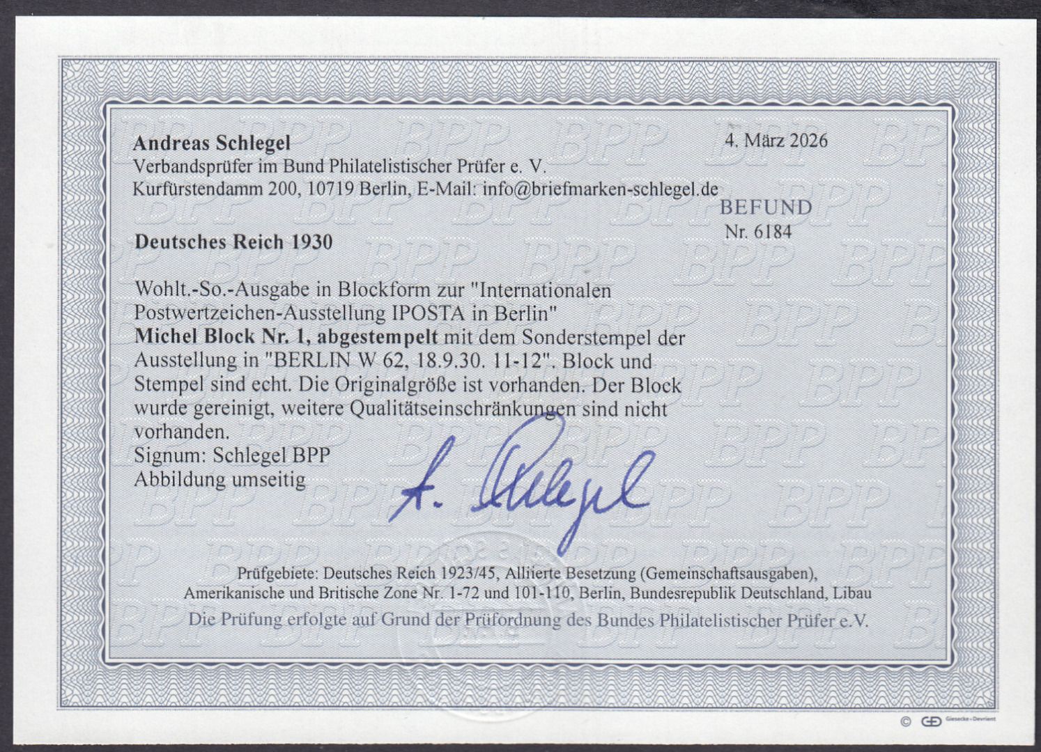 Block 1 Iposta gepr Schlegel BPP mit Befund Block und Stempel echt . Der Block wurde gereinigt daher mangel Optisch sehr ansprechend Michel 2000,00 . Sie bekommen den abgebildeten Artikel