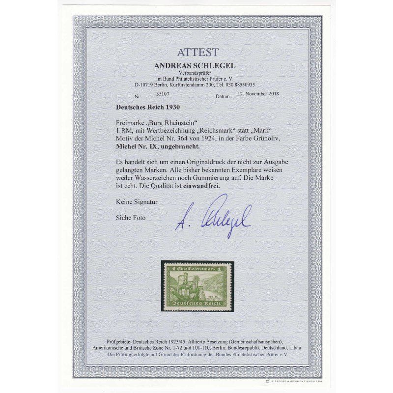1 RM Bauwerke (Burg Rheinstein) 1930, der unverausgabte Wert auf ungummiertem Papier mit Währungsbezeichnung in Reichsmark statt Mark, traumhaft in farbfrischer Farbe und perfekter Zähnung mit einem Michelwert von 18.000 Es handelt sich hierbei um eine der größten Seltenheiten des Deutschen Reiches. Fotoattest Schlegel BPP (2018) "DIE QUALITÄT IST EINWANDFREI" Sie bekommen den abgebildeten Artikel