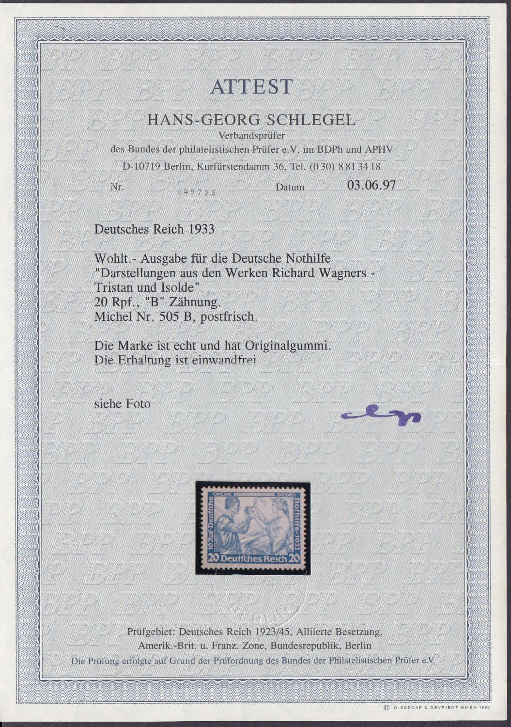 20 Pf. Wagner "B"-Zähnung postfrisch LUXUS! unsign. Fotoattest Schlegel D. "echt u. einwandfrei" Sie bekommen den abgebildeten Artikel