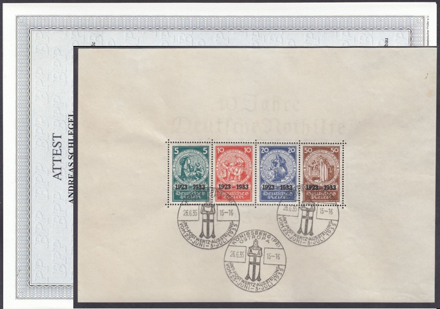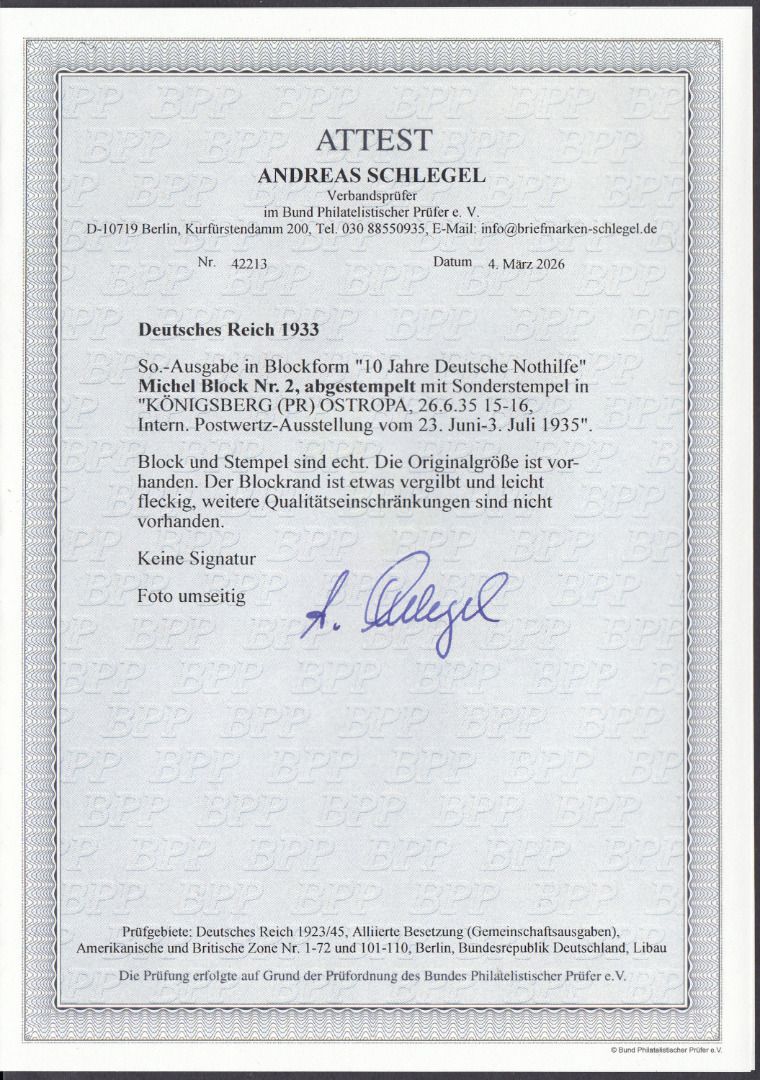 Sehr sauber und echt gestempelt geprüft Andreas Schlegel mit neuem Attest echt und geringen einschränkungen Schöne gelegenheit zum Erwerb dieses schön Block welchen immer fehlt zur großen Sammlun Deutsches Reich. Michel 10000,00 bzw wie hier mit schönem Sonderstempelt sogar mit 14.000 € bewertet.