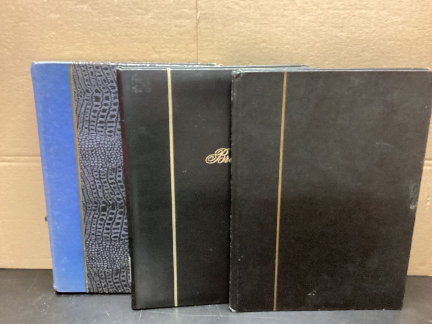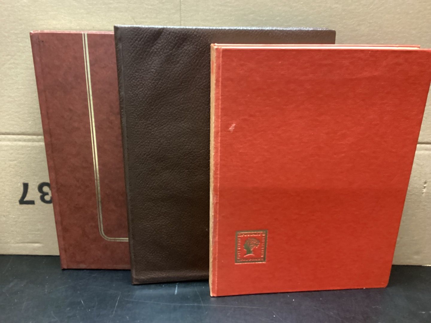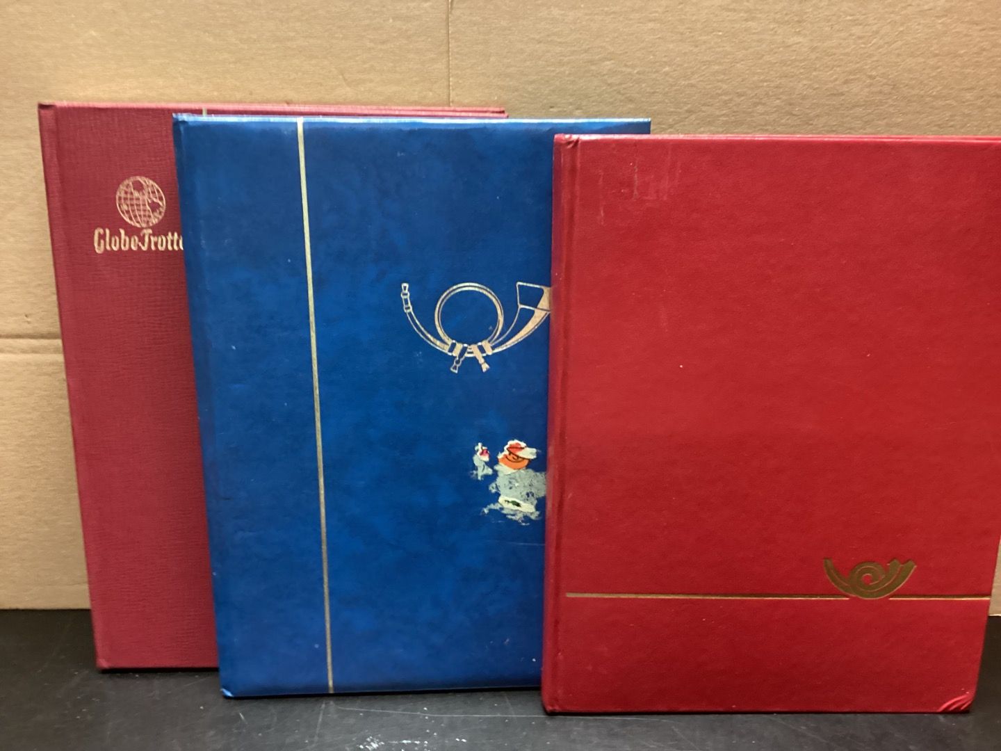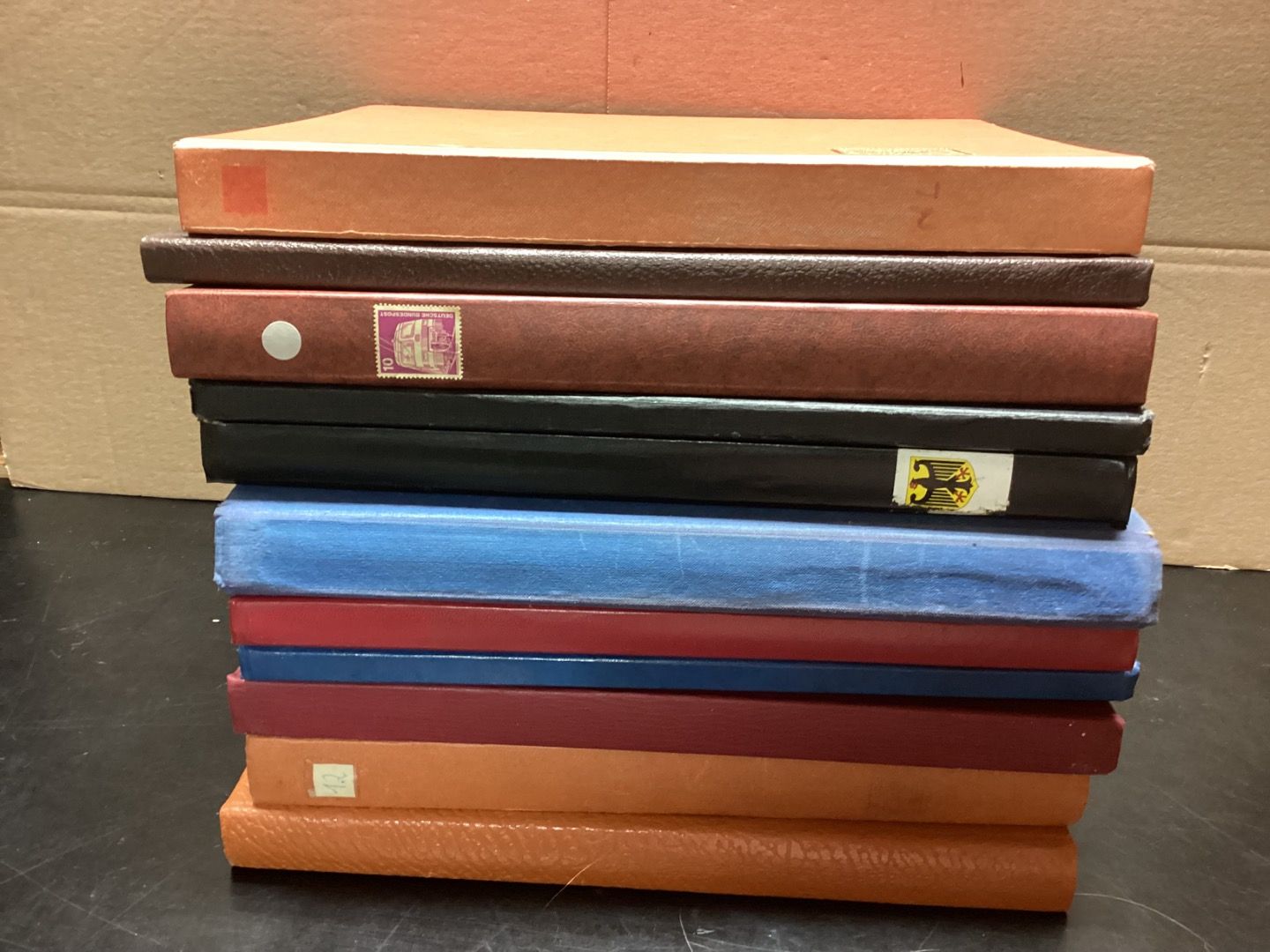 Eine Kiste voller Einsteckalben. 12 Stück, Seiten weiß.Alben mit verschiedenen Seitenanzahlen.Geteilt oder ungeteilt. Gebraucht mit kleinen Schönheitsfehlern. Klebespuren,Stoßkanten Druckstellen, Aufkleber (auch auf Pergastreifen), Risse im Einband. Kugelschreiberbeschriftung mit Michelnummern.Sie erhalten den abgebildeten Artikel.
