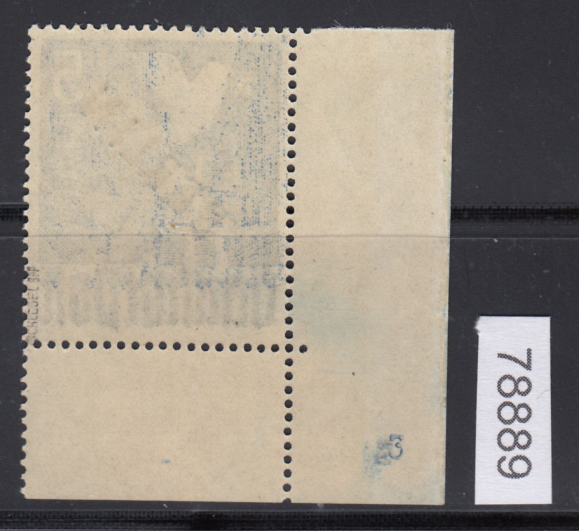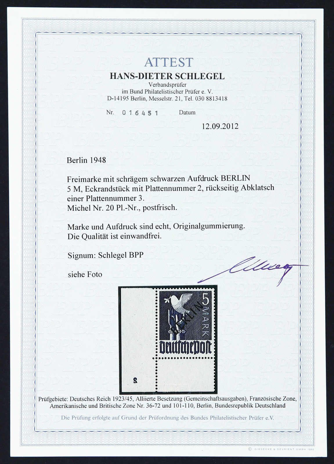 1948, 5 M. Schwarzaufdruck als postfrisches Eckrandstück unten links mit freistehender spiegelverkehrter Platten-Nr. 2, rücks. Abklatsch einer normalen PN 3 sowie der tiefgeprägte Blinddruck der PN 2, ungefaltet, sign. und Fotoattest Schlegel BPP