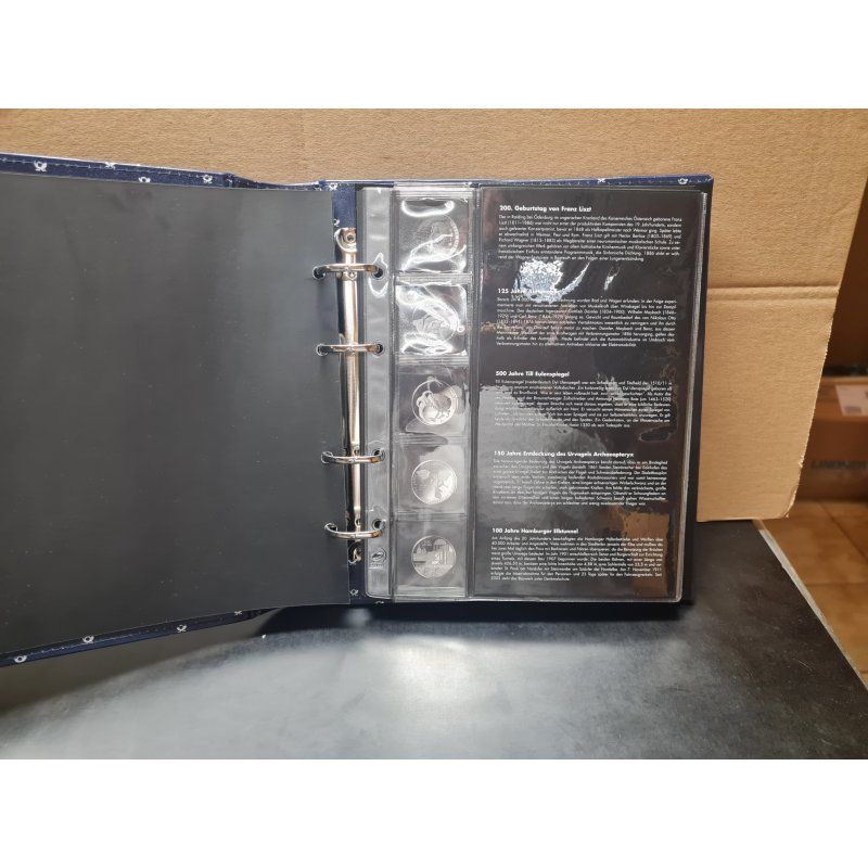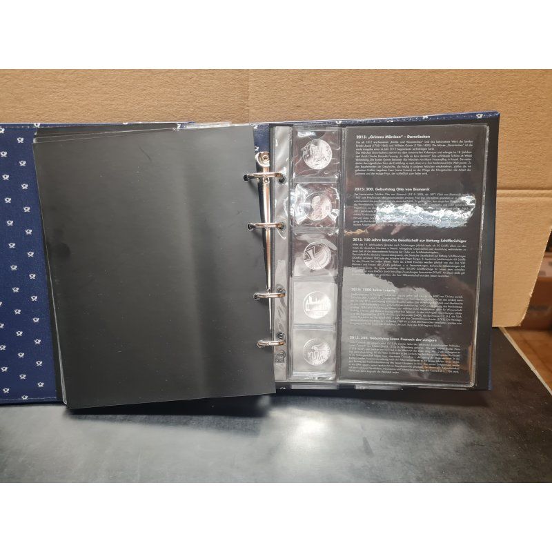 Dunkelblaues Alben mit Schuber für deutsche 10 - EURO - Gedenkmünzen incl. Vordruckblätter 2011-15 und transparenten Münzhüllen. Münzen sind auf den Vordruckblättern schwarz-weiß abgebildet. Vordruckblätter mit numismatischen Daten und Hintergrund - Informationen zum Motiv und Ausgabeanlass. Sehr gut erhalten mit geringen Gebrauchsspuren. Geliefert wird der abgebildete Artikel Nur einmal Porto bei Mehrfachkäufen