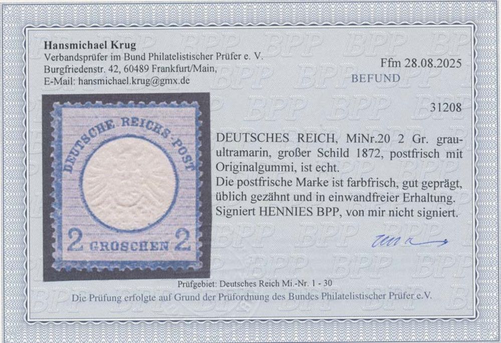 2 Gr. gr. Schild postfrisch tadellos! gepr. Hennies u. neuer Befund Krug "echt u. einwandfrei" |