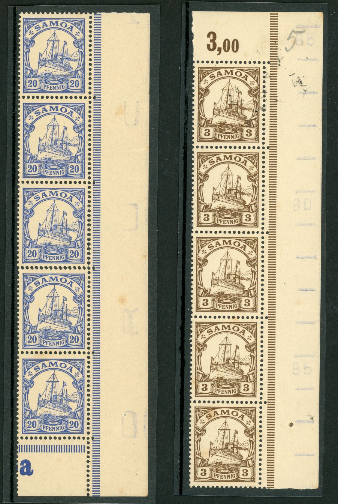 Samoa 7,10 (5) Postfrisch 3 und 20 Pfg. in senkr. ER-5erStreifen mit Rand Zud...
