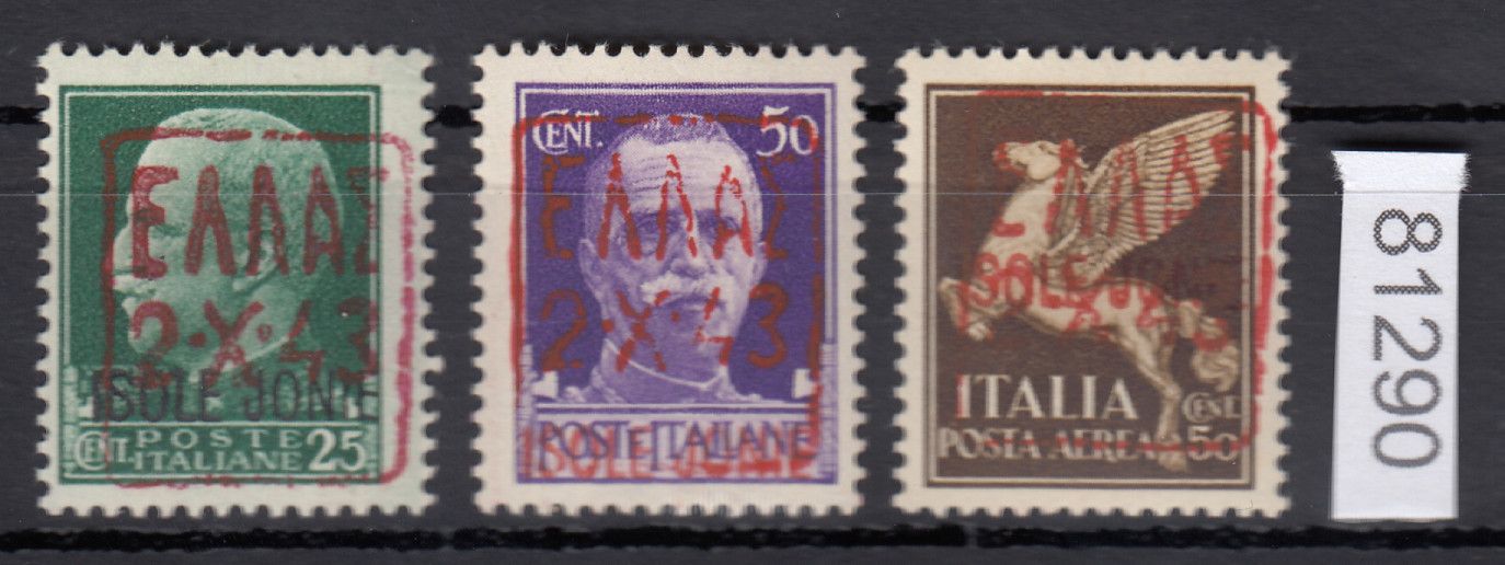 25 C. - 50 C. Freimarken und Flugpostmarke der Ionischen Inseln 1943, postfrische Erhaltung, roter Aufdruck, jeder Wert geprüft Brunal BPP. Mi. 600,- Auflage nur 2000-3000 Stück . Sie bekommen den abgebildeten Artikel