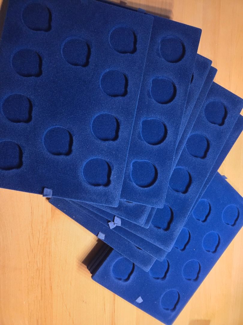 11 Neuwertige Münz Tabletts Einlagen für je 10 Münzen bis 42 mm Durchmesser, blauer Samt, 295 x 205 mm, mit geringen Lagerspuren