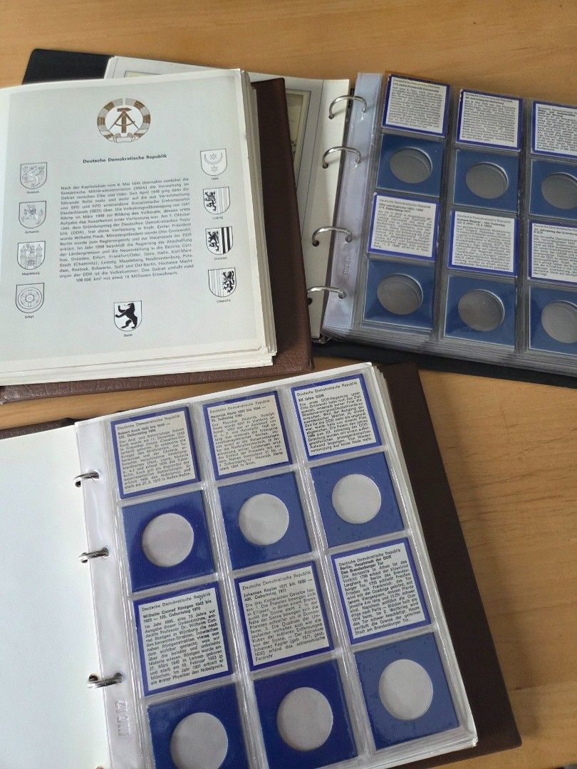 3 Münz Alben mit Vordrucken und Informationen zud den Gedenkmünzen und den Umlaufmünzen der DDR, Alben beinhalten die 5, 10 und 20 Mark Münzvordrucke der DDR, Münzen können in den Vordruck eingedrückt werden und im Sammelalbum untergebracht werden. gebraucht - gut erhalten, mit Gebrauchsspuren