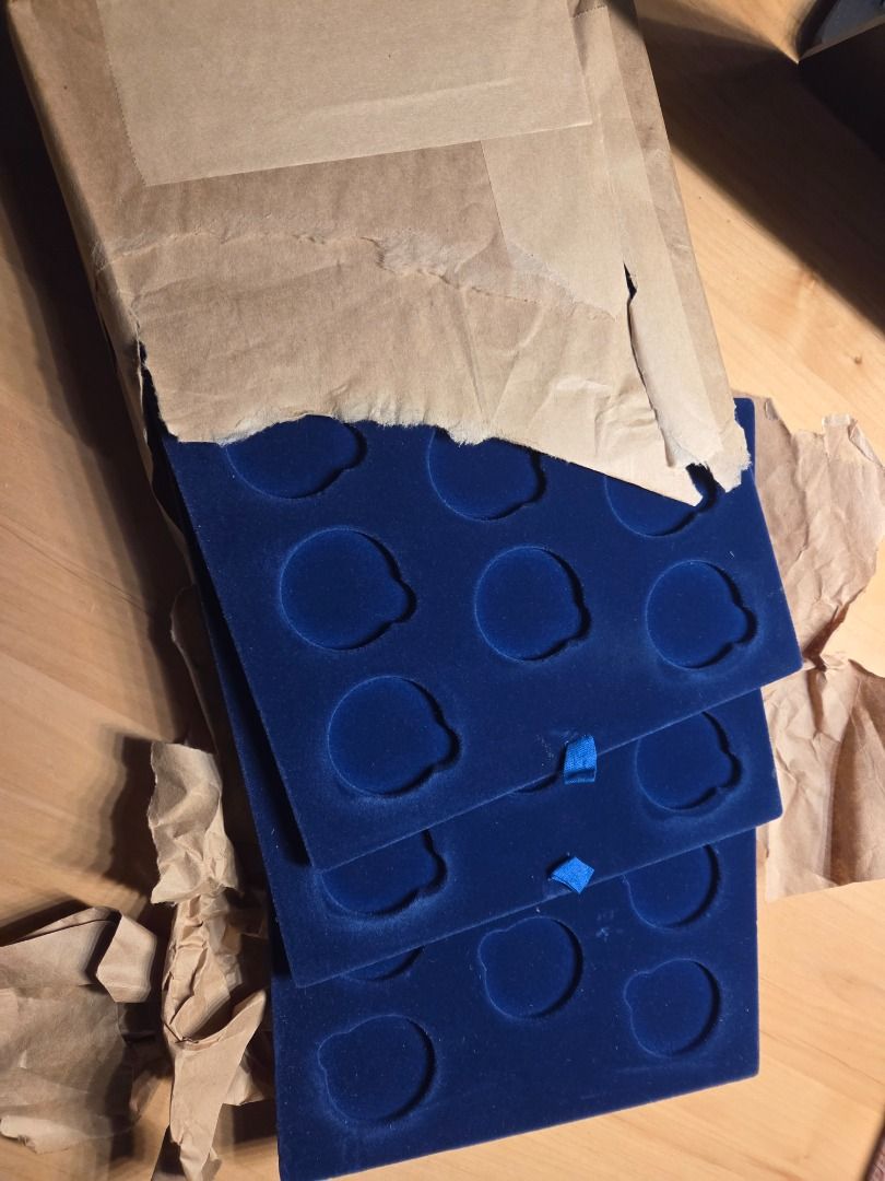 5 Neuwertige Münz Tabletts Einlagen für je 14 Münzen bis 42 mm Durchmesser, blauer Samt, 295 x 205 mm, mit geringen Lagerspuren