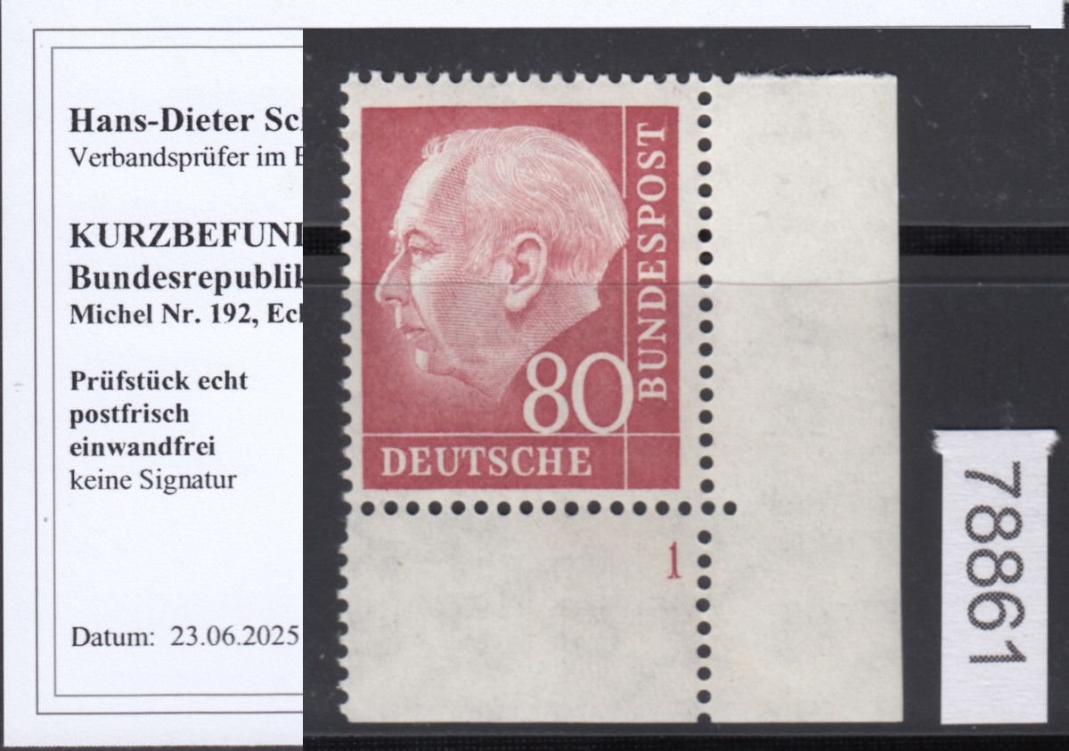1954, 80 Pfg. Heuss (I), postfrische Bogenecken mit Formnummer, Fo.Nr. "1" einwandfrei, Fotobefunde Schlegel BPP 06/2025