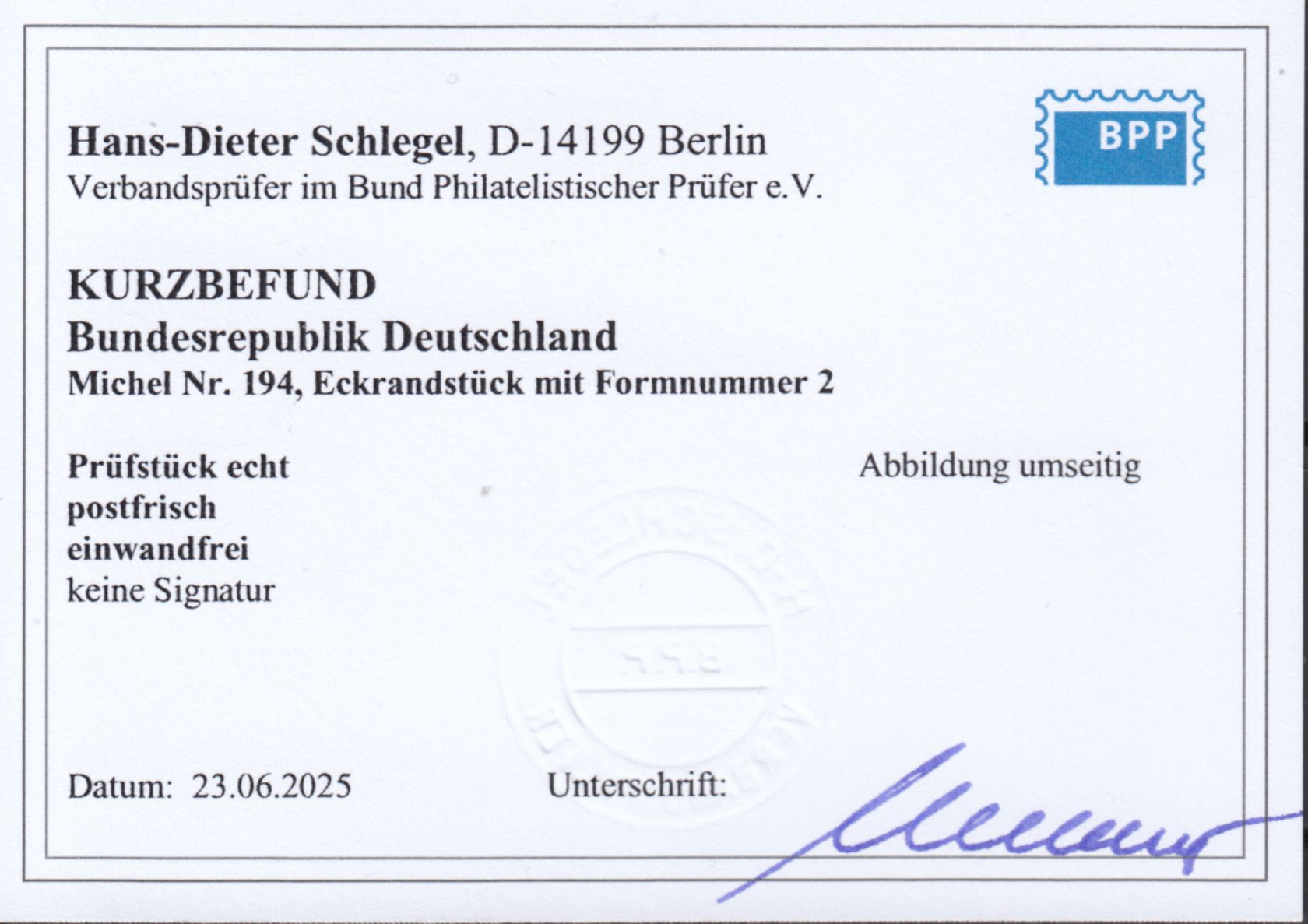 Bund 1954, Mich.-Nr.: 194 w ** FN 2  Eckrand  Zähnung R  glattes gummi   gepr.  Befund