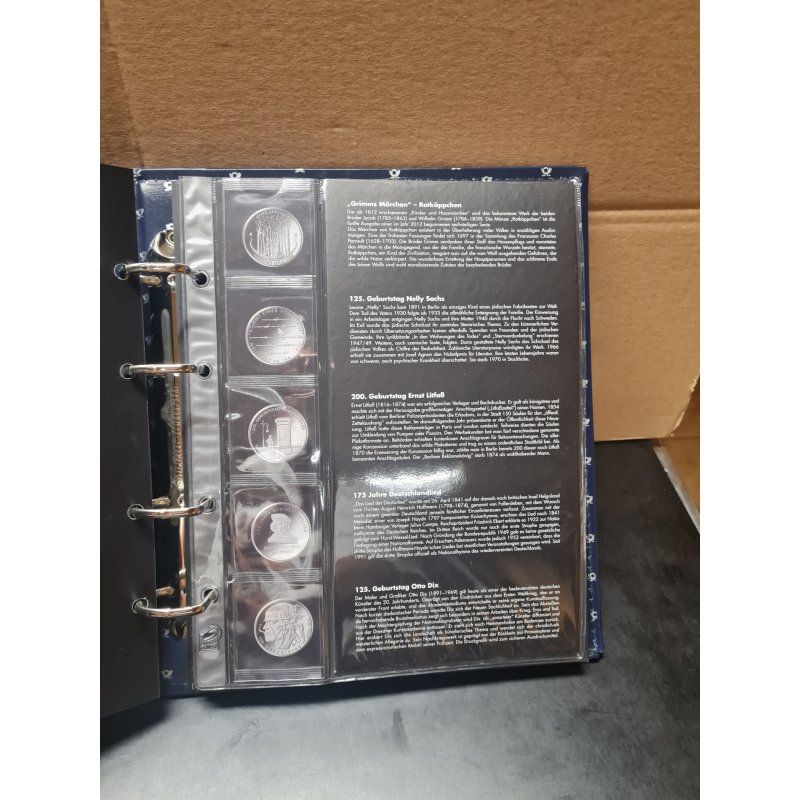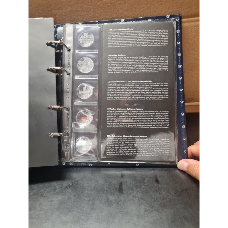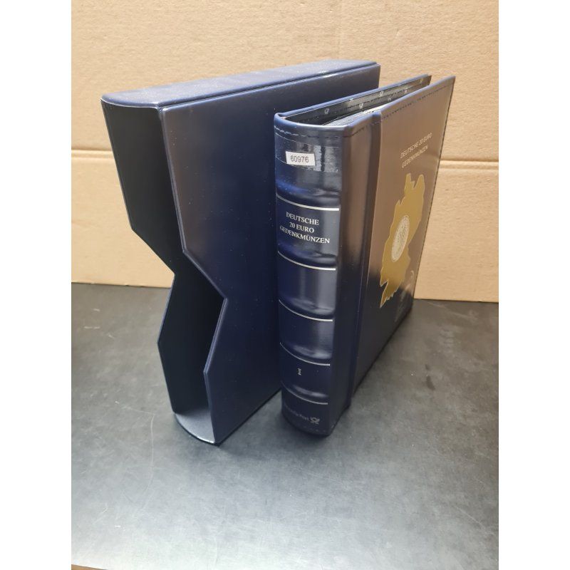 Dunkelblaues Alben mit Schuber für deutsche 20 - EURO - Gedenkmünzen incl. Vordruckblätter 2016-19 und transparenten Münzhüllen. Münzen sind auf den Vordruckblättern schwarz-weiß abgebildet. Vordruckblätter mit numismatischen Daten und Hintergrund - Informationen zum Motiv und Ausgabeanlass. Sehr gut erhalten mit geringen Gebrauchsspuren. Geliefert wird der abgebildete Artikel Nur einmal Porto bei Mehrfachkäufen
