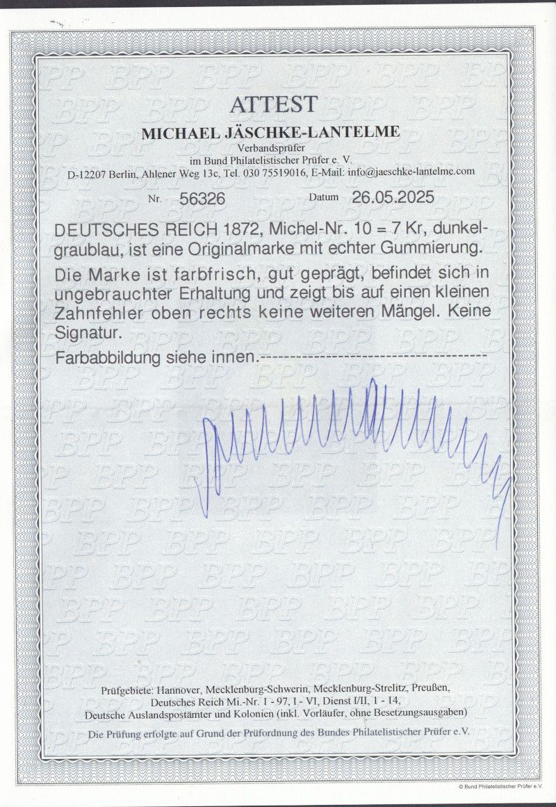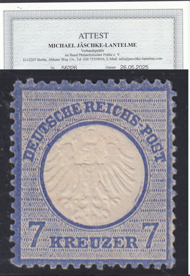 7 Kreuzer kleiner Brustschild 1872, ungebrauchte Marke mit Originalgummi ist farbfrisch und gut geprägt. Sie hat einen kürzere Zähn, ansonsten in einwandfreier Erhaltung. Ungebraucht eine seltene Marke. Fotoattest Jäschke-Lantelme BPP (2025) Mi. 3.200,-€. Sie bekommen den abgebildeten Artikel