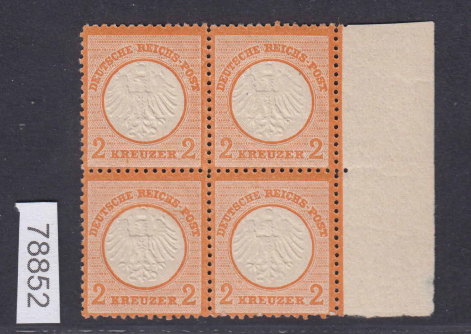 1872, 2 Kr. orange als postfrischer Viererblock vom rechten Seitenrand, unten etwas unregelmäßige Zähnung, dabei ein kurzer Zahn, ein Wert signiert Schwenn