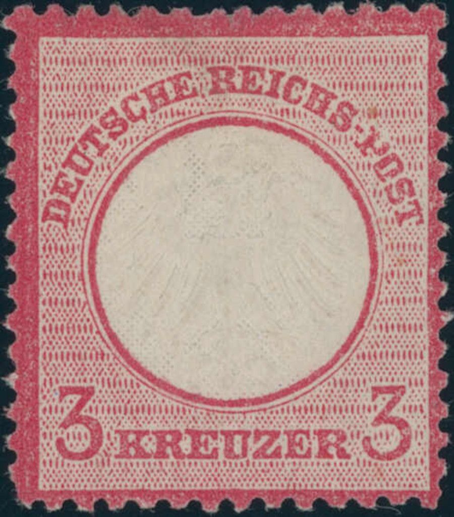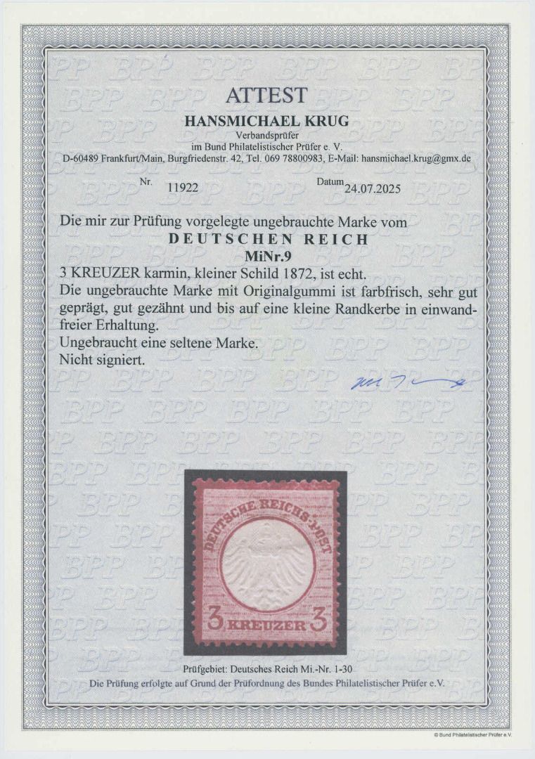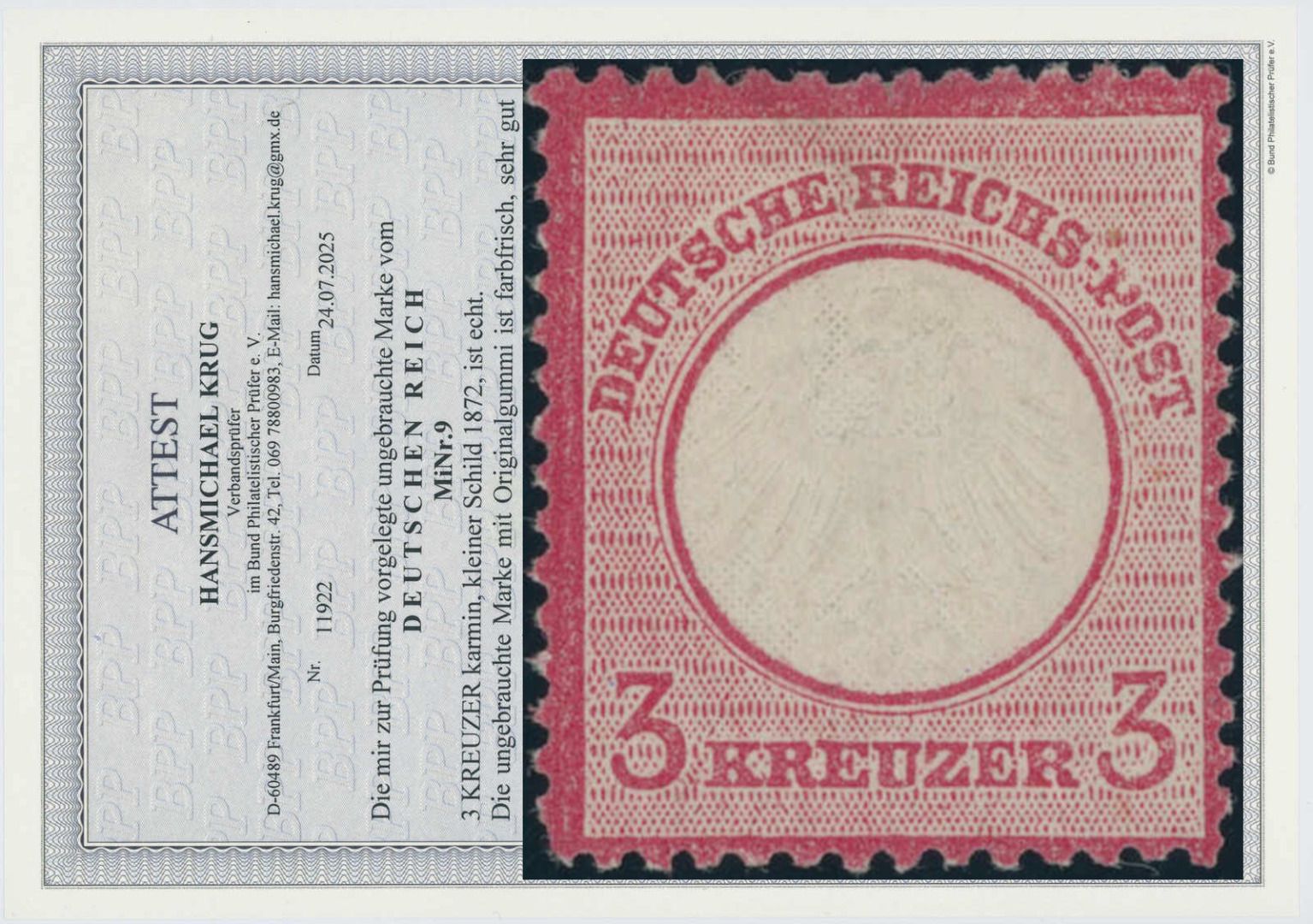 1872, 3 Kr., karmin, kleiner Schild, sauber ungebrauchtes Stück mit Originalgummi und Falzrest, am Oberrand eine winzige Randkerbe, praktisch zu vernachlässigen, sonst in tadelloser Kabinetterhaltung, ungebraucht eine der seltenen Brustschildmarken, ohne Signaturen und gepr. Krug mit neuem Fotoattest, Mi. Mi. 2400,--.