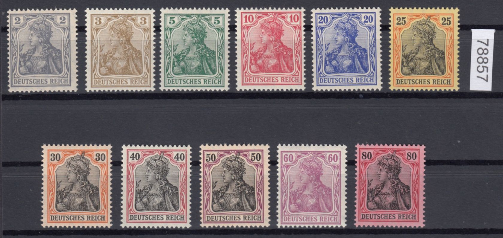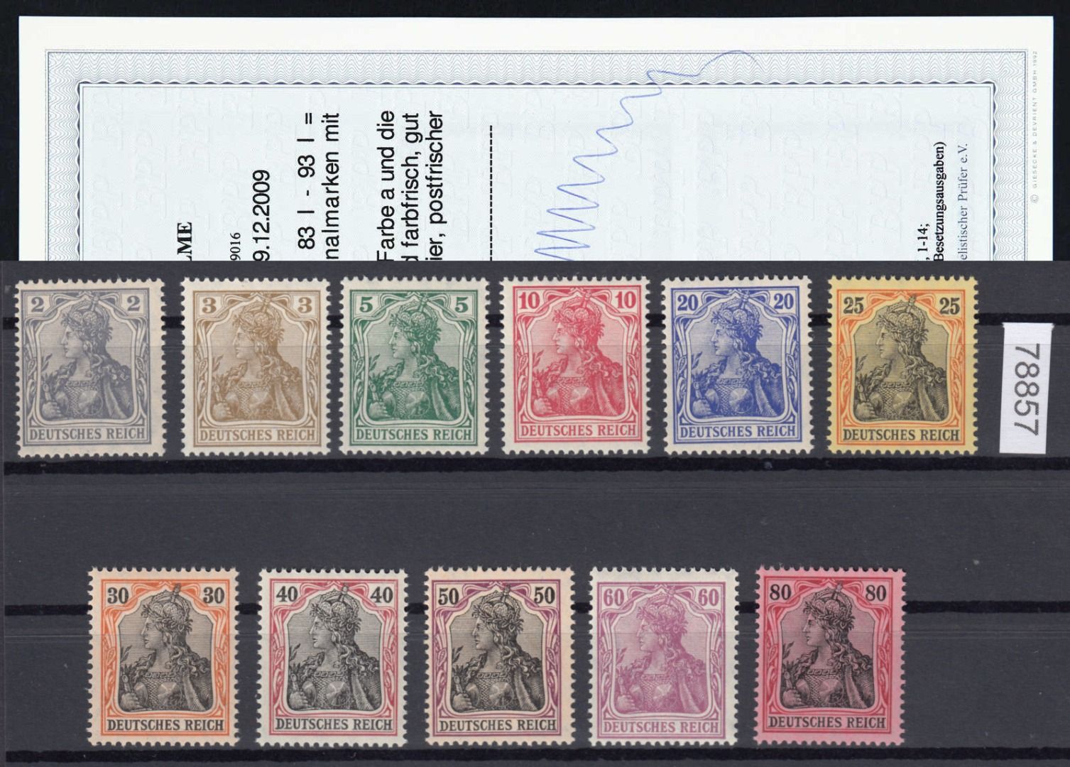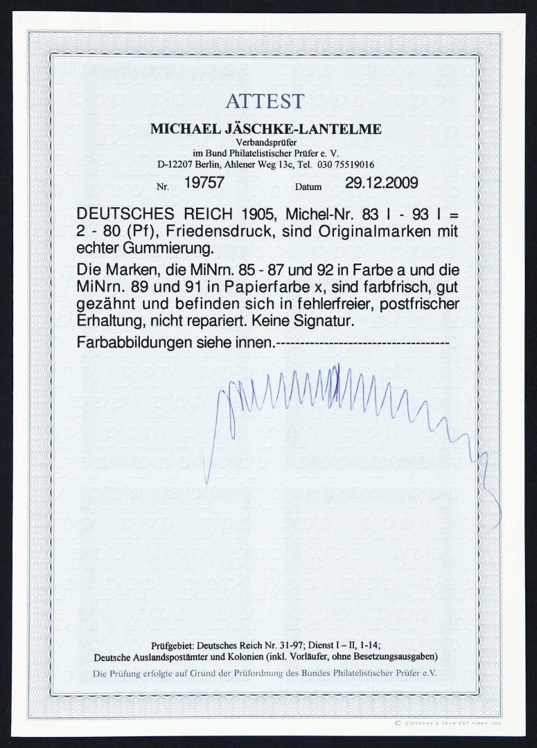 1905, 2 bis 80 Pfg. Germania Friedensdruck als postfrischer Satz, Mi-Nr. 85-87 und 92 in Farbe a und die 89 und 91 in Papierfarbe x, in einwandfreier Qualität, Fotoattest Jäschke-Lantelme BPP (ME 1.800,-)