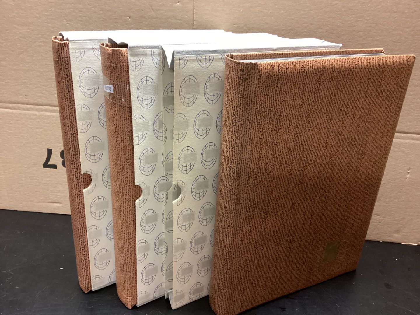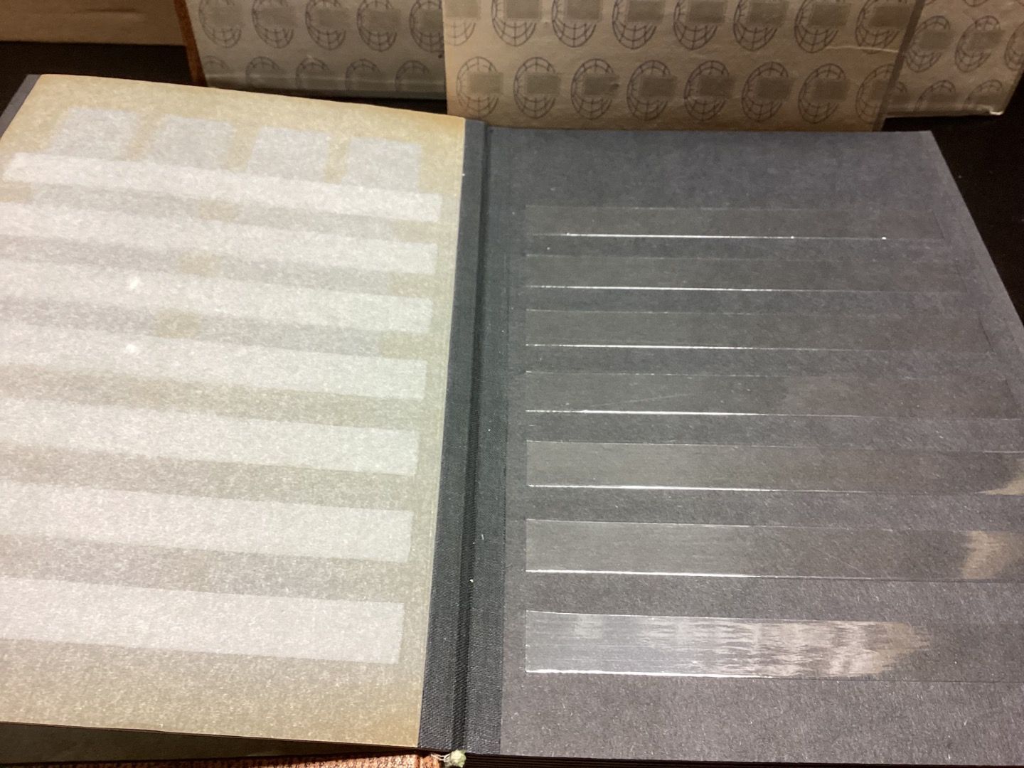 3 Stück Einsteckalben , schwarze Seiten..Alben mit je 32 Seiten. 7 Folienstreifen,zwischen den Seiten Pergaminblätter mit leichten Vergilbungen am Rand..Sie erhalten den abgebildeten Artikel. Mehrfach bestellen,nur einmal Porto.