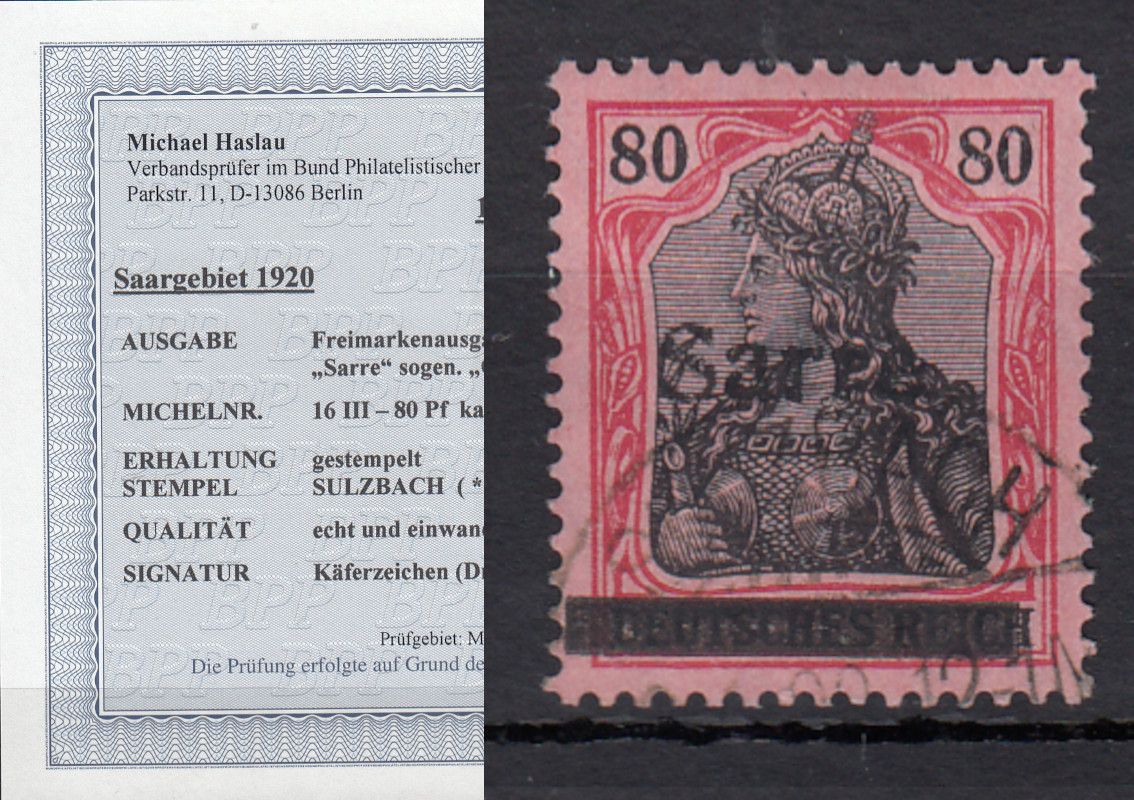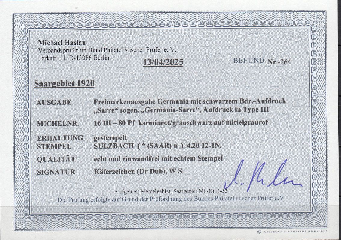 Sauber gestempelt, geprüft Haslau BPP    Befund   echt und einwandfrei