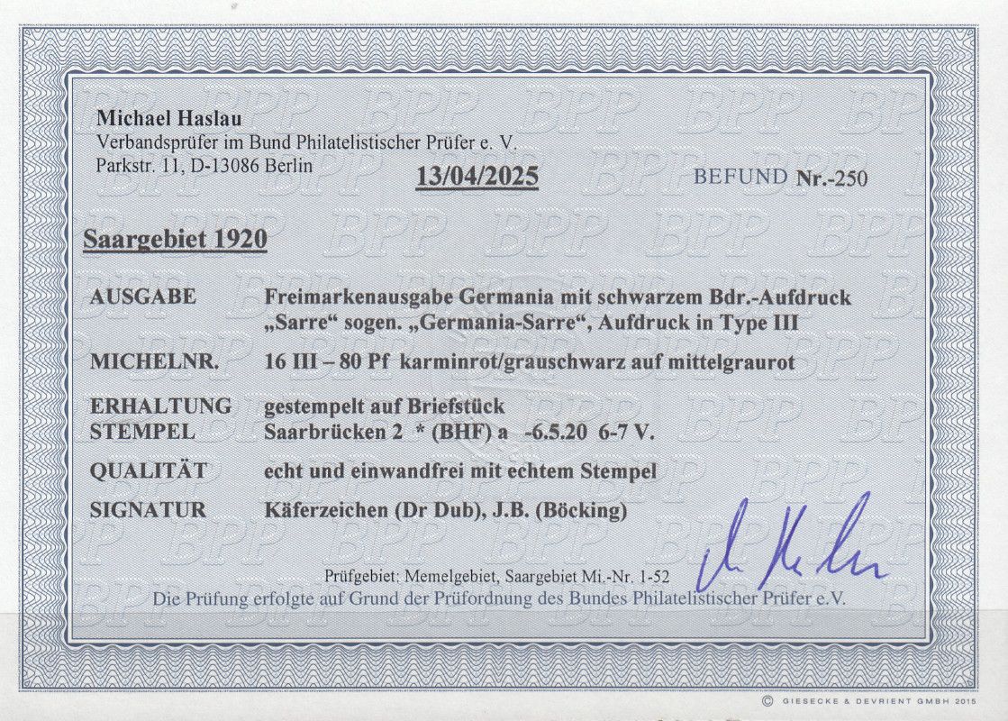 Sauber gestempelt, geprüft Haslau BPP    Befund   echt und einwandfrei