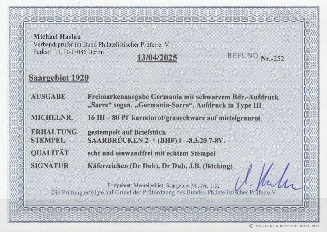Saargebiet 1920 Mi. Nr. 16 III gestempelt geprüft Befund