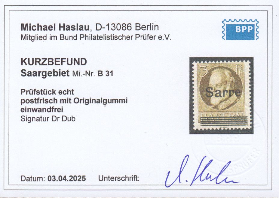 Postfrisch geprüft mit Befund  Haslau BPP   echt und einwandfrei