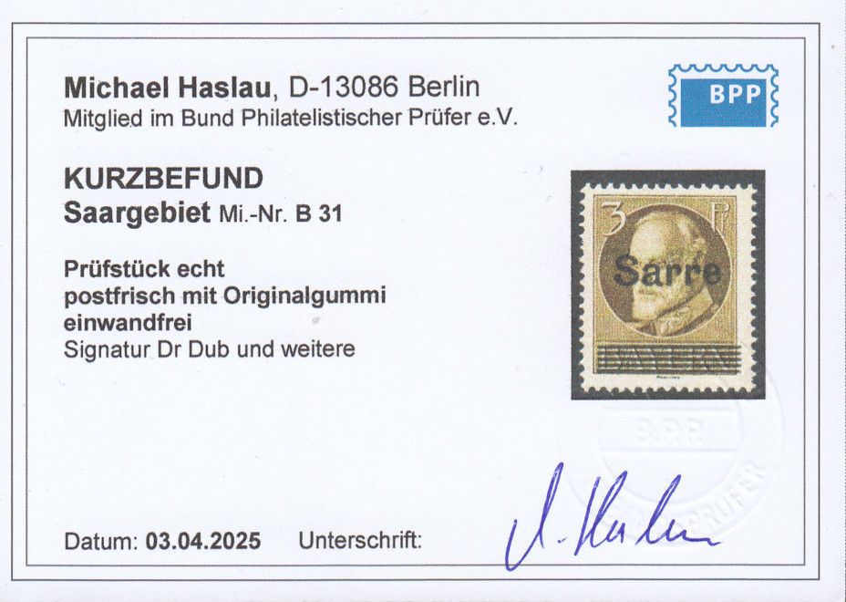 Postfrisch geprüft mit Befund  Haslau BPP   echt und einwandfrei