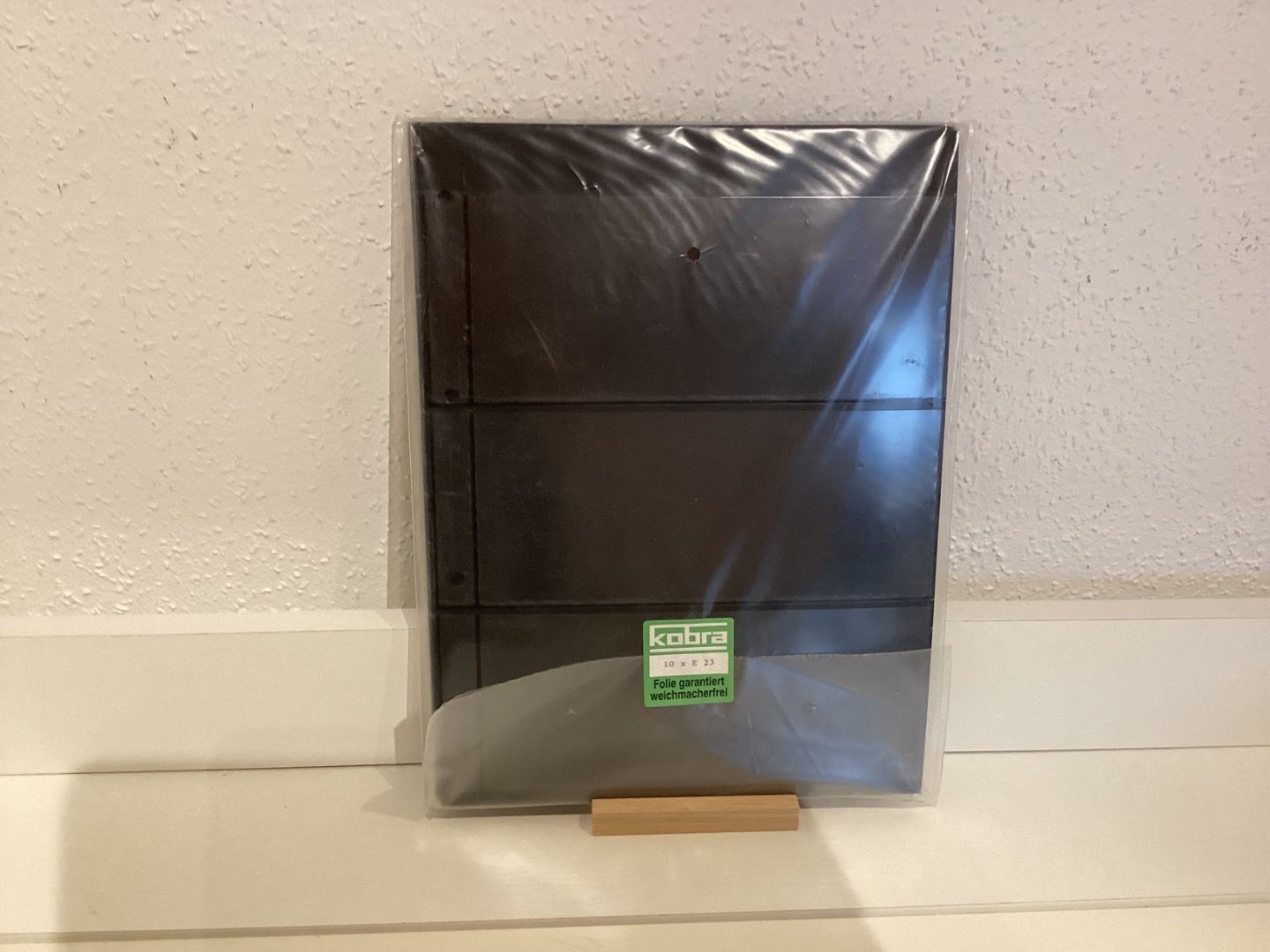 KOBRA Einsteckblätter E 23 schwarz. 10 Hüllen aus Kunststoff. 3 Taschen beidseitig nutzbar .4 Ring- Normlochung ( 80mm Lochabstand) für A4 Ringbinder. Neuwertig,unbenutzt aus Lagerbestand. Mehrfach bestellen,nur einmal Porto.