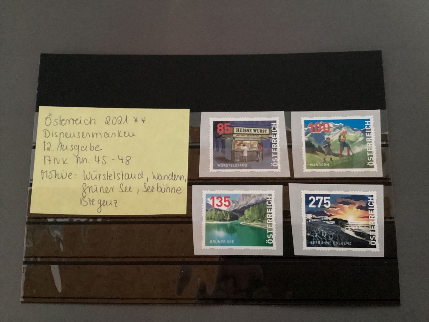 Dispensermarken postfrisch 2021 Serie 12. Ausgabe ANK 45-48. Dispensermarken sind spezielle Barfreimachungsbelege der Österreichischen Post AG. Sie dienen als Barfreimachung am Schalter,nicht als klassische Briefmarken für den Verkauf an Sammler am Schalter.Postfrisch über Sammler- Abonnnements erhältlich.Sie werden in der Regel dreimal jährlich in Sätzen mit vier verschiedenen Wertstufen ausgegeben. Die Marken zeigen oft Motive wie Landschaften,Traditionen oder Bauwerke aus Österreich.Mehrfach bestellen,nur einmal Porto. Sie erhalten den abgebildeten Artikel.
