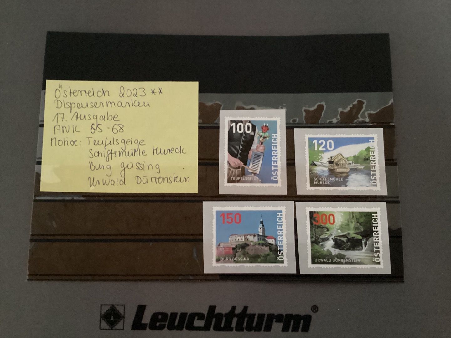 Dispensermarken postfrisch 2023 Serie 17. Ausgabe ANK 65-68.Dispensermarken sind spezielle Barfreimachungsbelege der Österreichischen Post AG. Sie dienen als Barfreimachung am Schalter,nicht als klassische Briefmarken für den Verkauf an Sammler am Schalter.Postfrisch über Sammler- Abonnnements erhältlich.Sie werden in der Regel dreimal jährlich in Sätzen mit vier verschiedenen Wertstufen ausgegeben. Die Marken zeigen oft Motive wie Landschaften,Traditionen oder Bauwerke aus Österreich.Mehrfach bestellen,nur einmal Porto. Sie erhalten den abgebildeten Artikel.