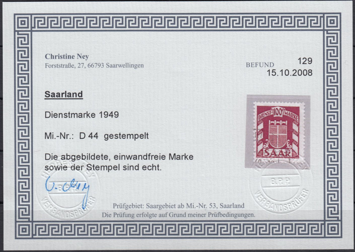 100 Fr. Dienstmarke 1949, tadellos in gestempelter Luxuserhaltung. Fotobefund Ney BPP >einwandfrei<. Mi. 430,-€.