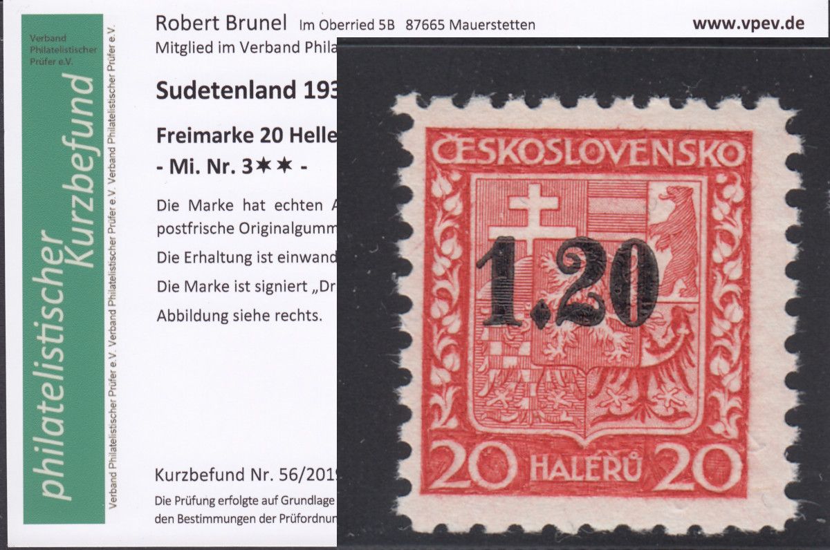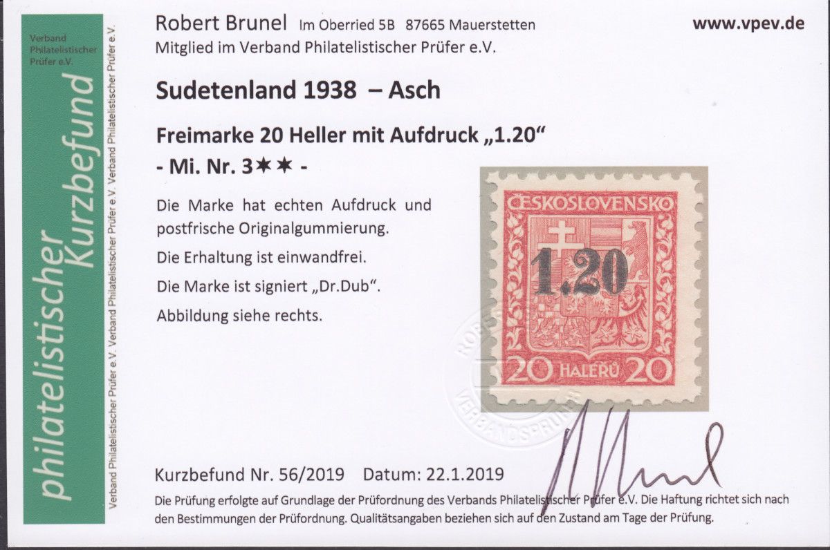 Sudetenland Asch, Mi.-Nr.   3  **  geprüft   Befund