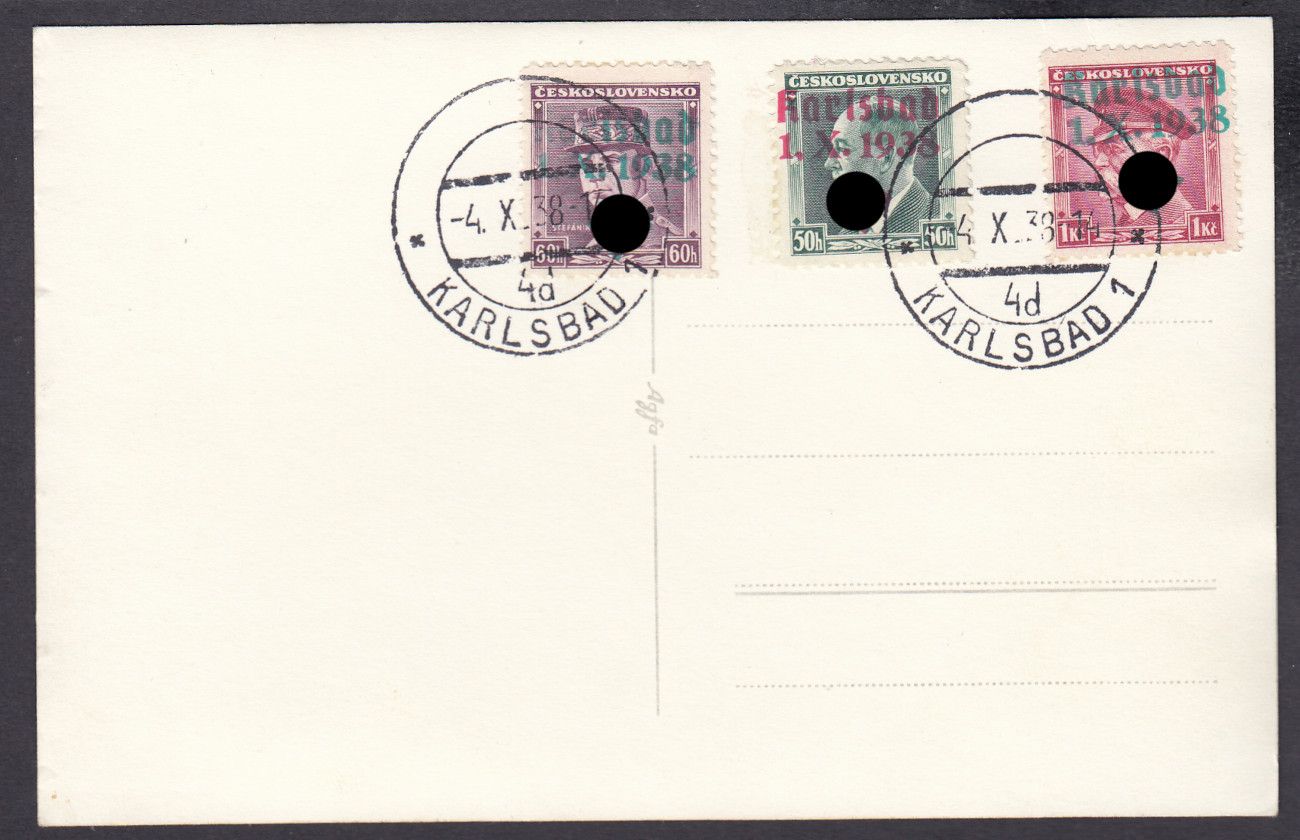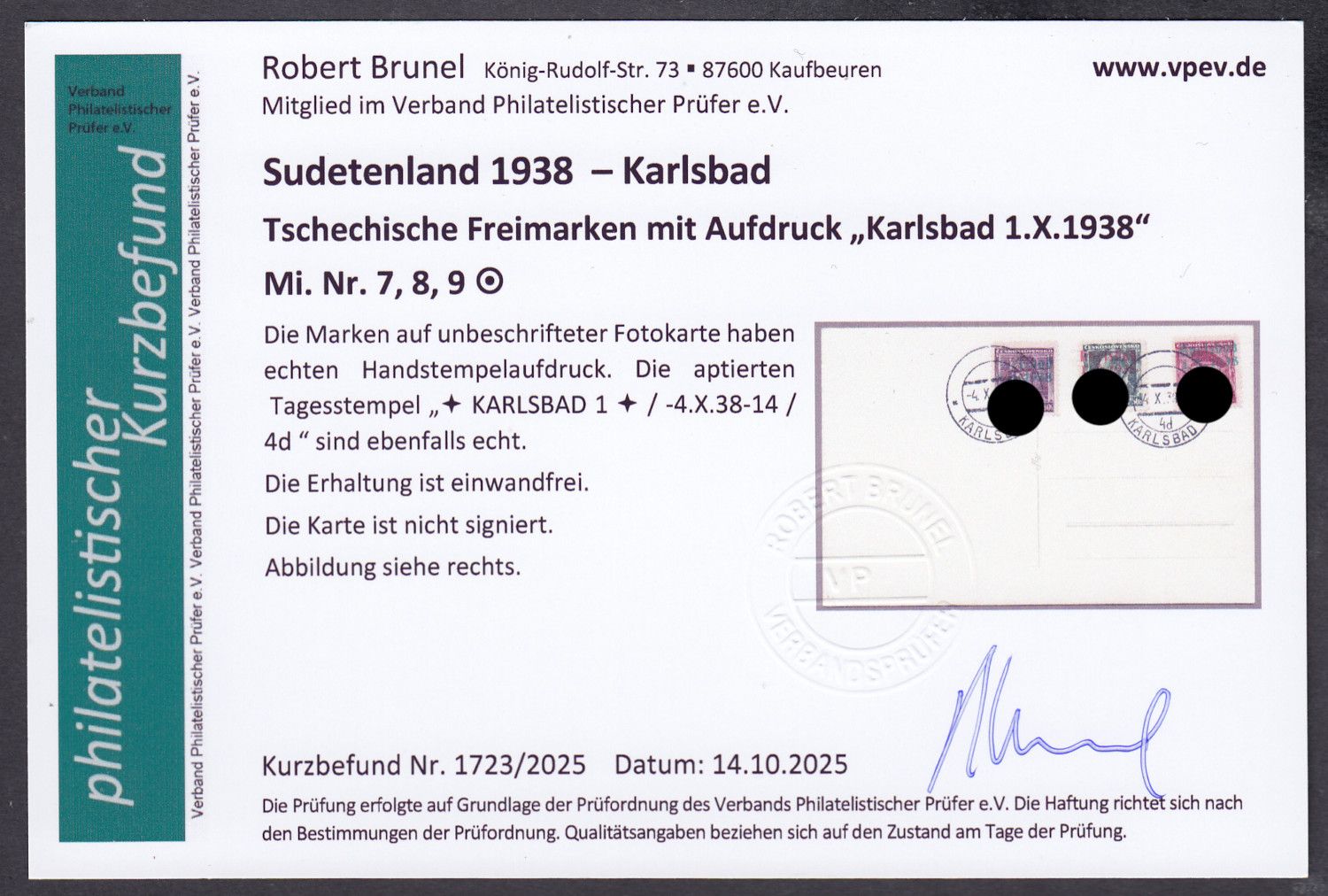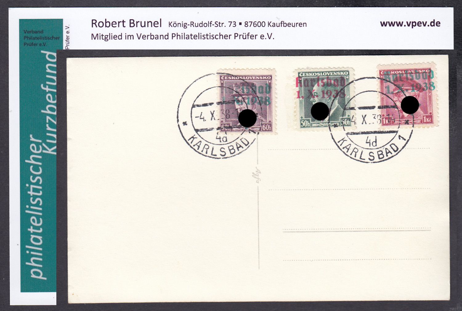 Sudetenland Karlsbad, Mi.-Nr.   7+8+9  gestempelt  geprüft  Befund  auf schöner Pr.-Karte